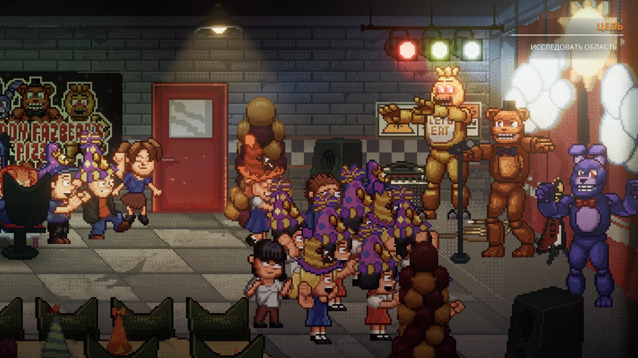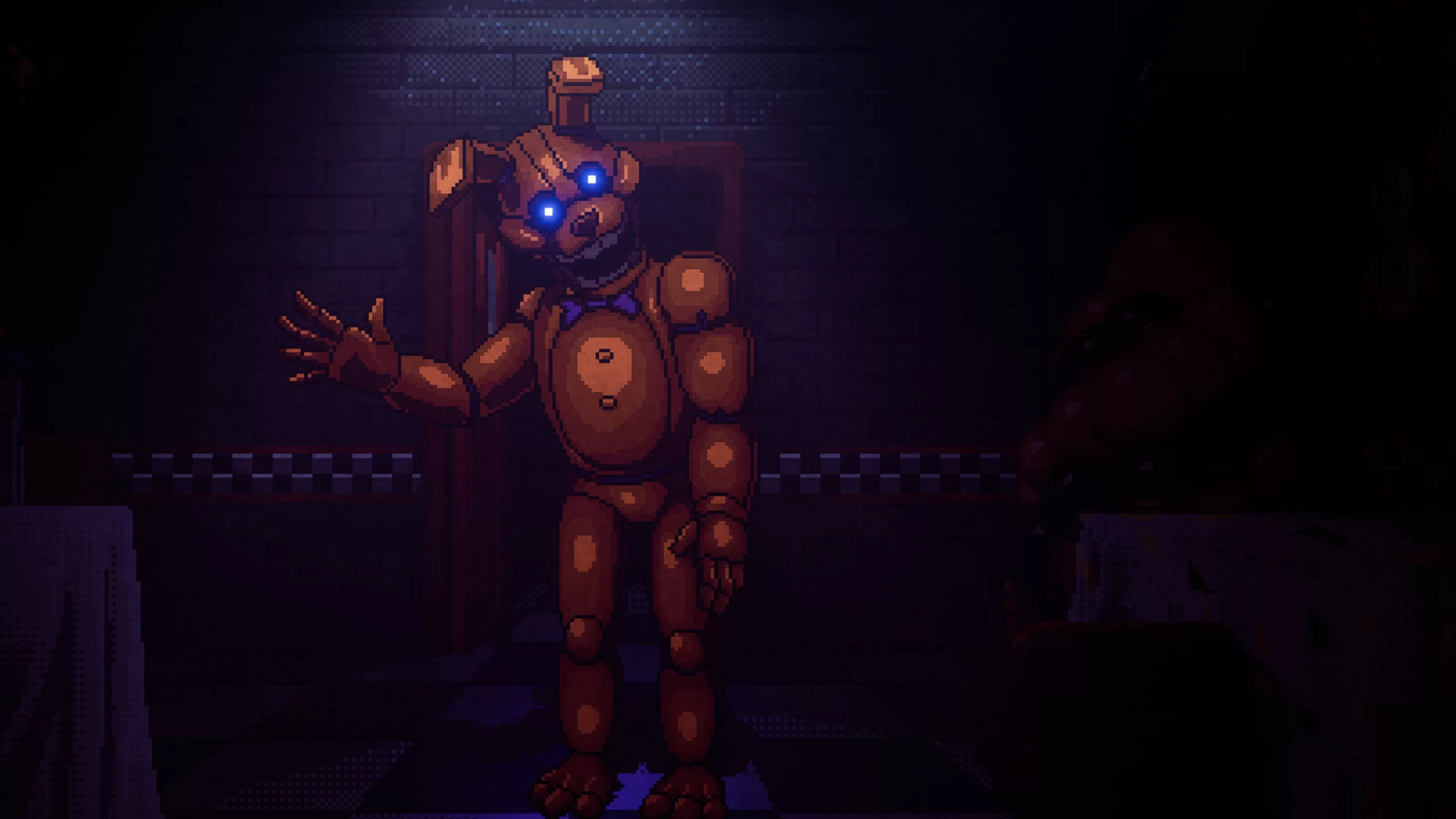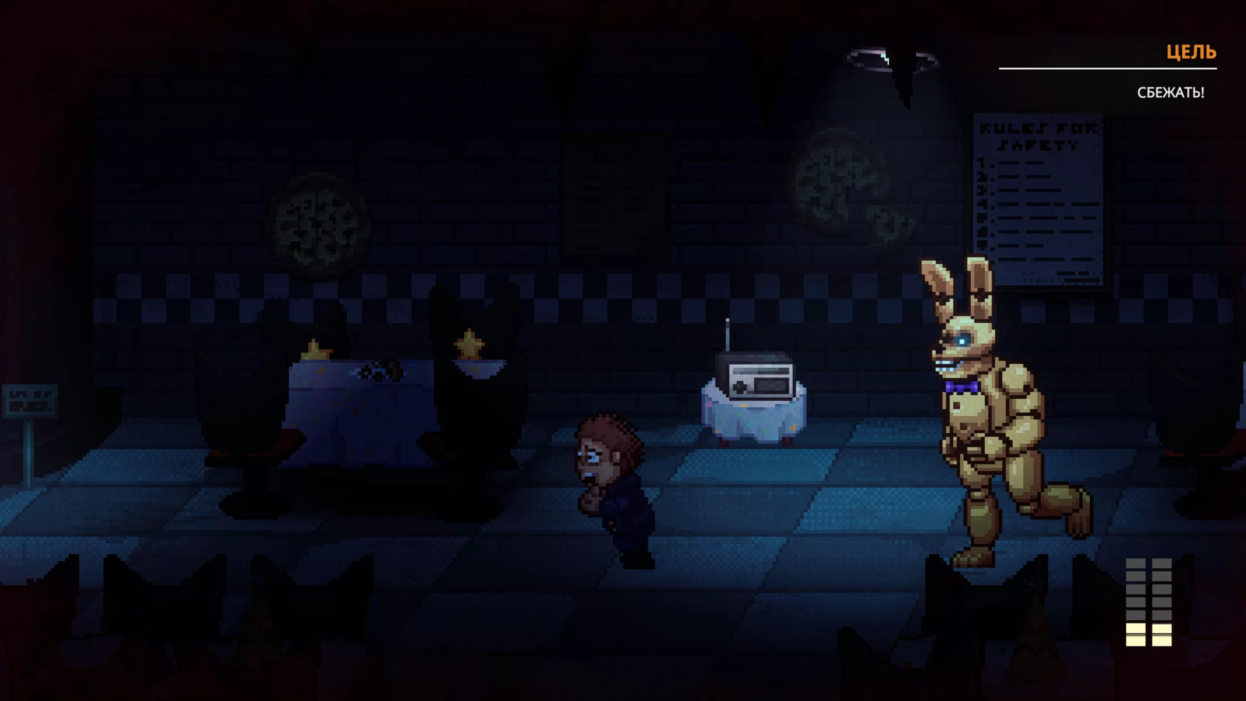 Игра выделяется качественной ретро-графикой, создающей напряжённую атмосферу ужаса. Детализированные тёмные локации усиливают чувство тревоги, а дизайн аниматроников делает каждую встречу с ними по-настоящему пугающей. Музыкальное сопровождение и звуковые эффекты идеально подчёркивают мрачную атмосферу, добавляя происходящему интенсивности.
