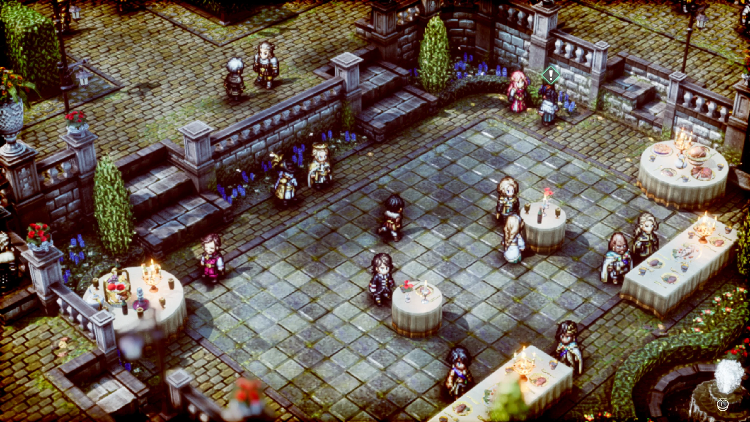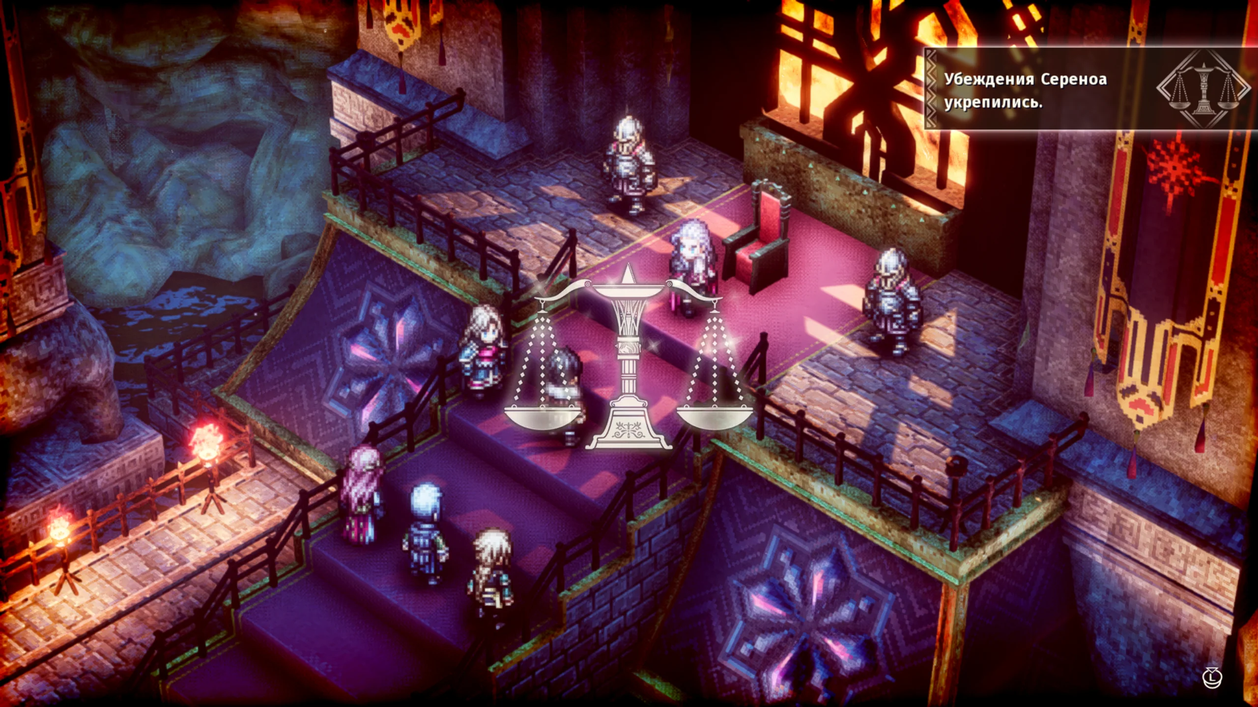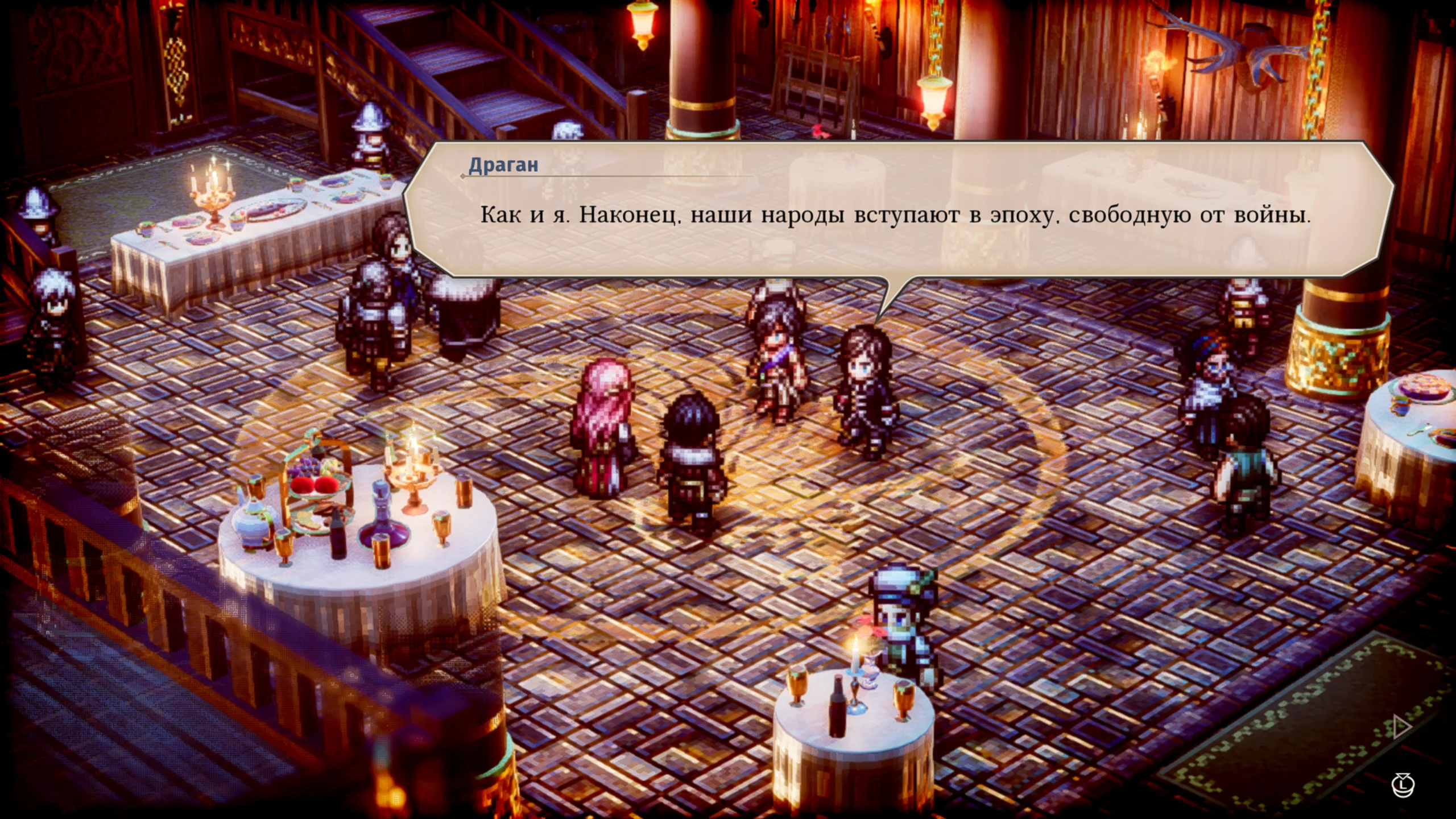 Triangle Strategy впечатляет эффектным стилем HD-2D, в котором классическая пиксельная анимация сочетается с современными визуальными приёмами — мягким освещением, туманом и отражениями. Этот художественный подход создаёт атмосферу живой диорамы, где каждый кадр напоминает миниатюрную картину. Музыкальное сопровождение, написанное композитором Акирой Сэндзю, усиливает драматизм происходящего, а качественная озвучка придаёт диалогам эмоциональную выразительность.