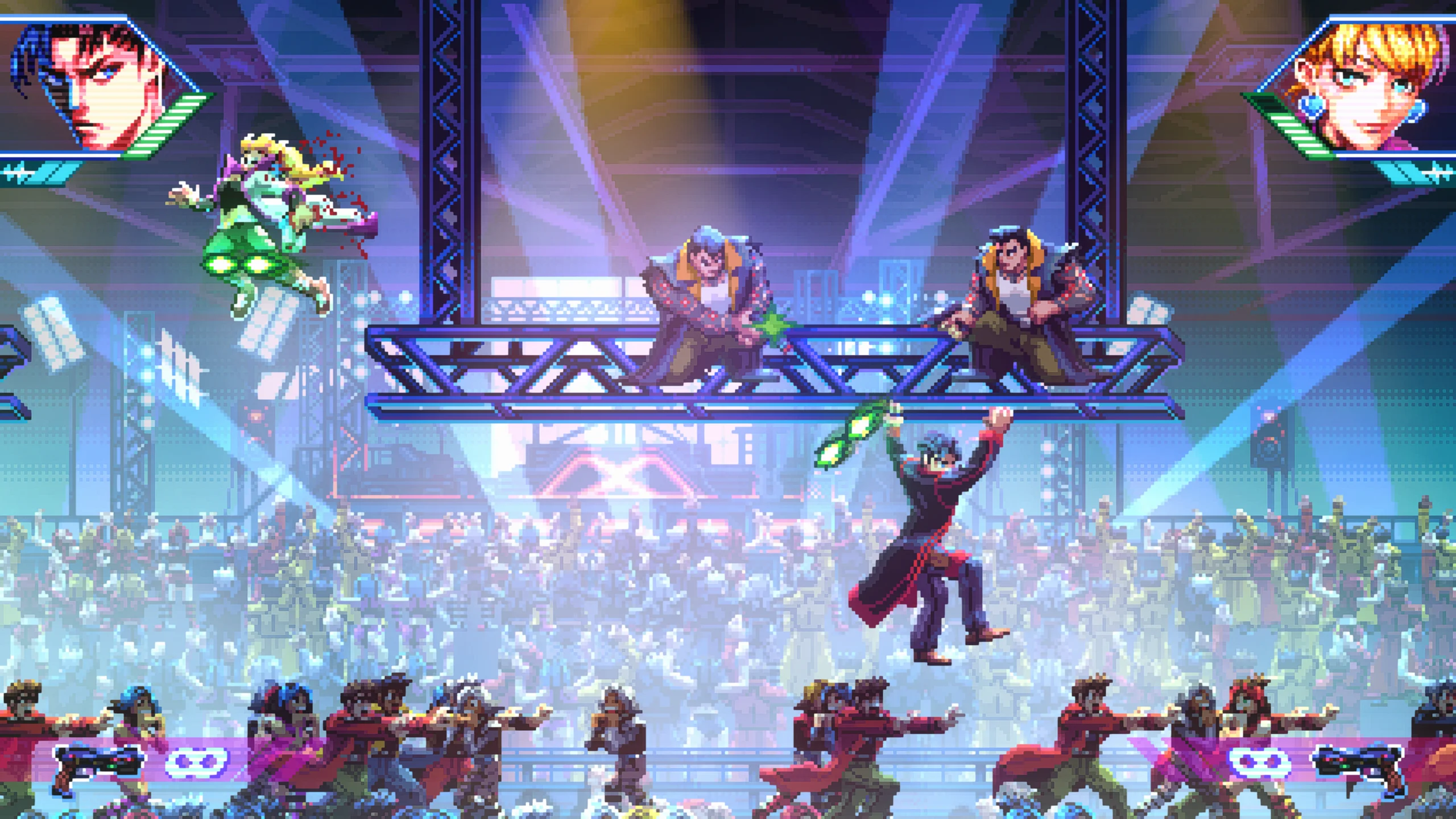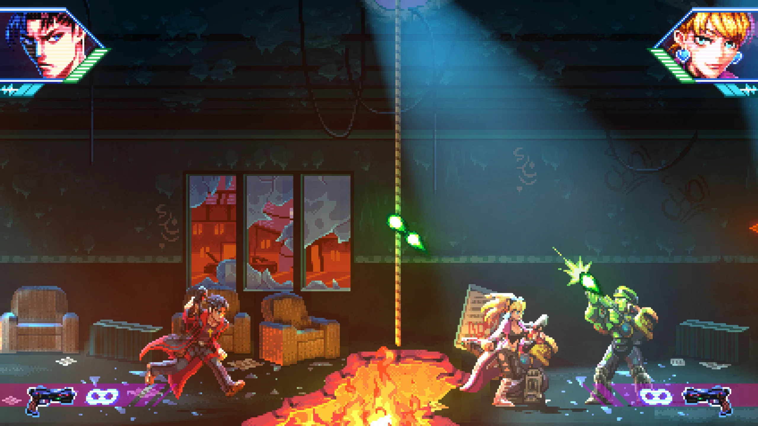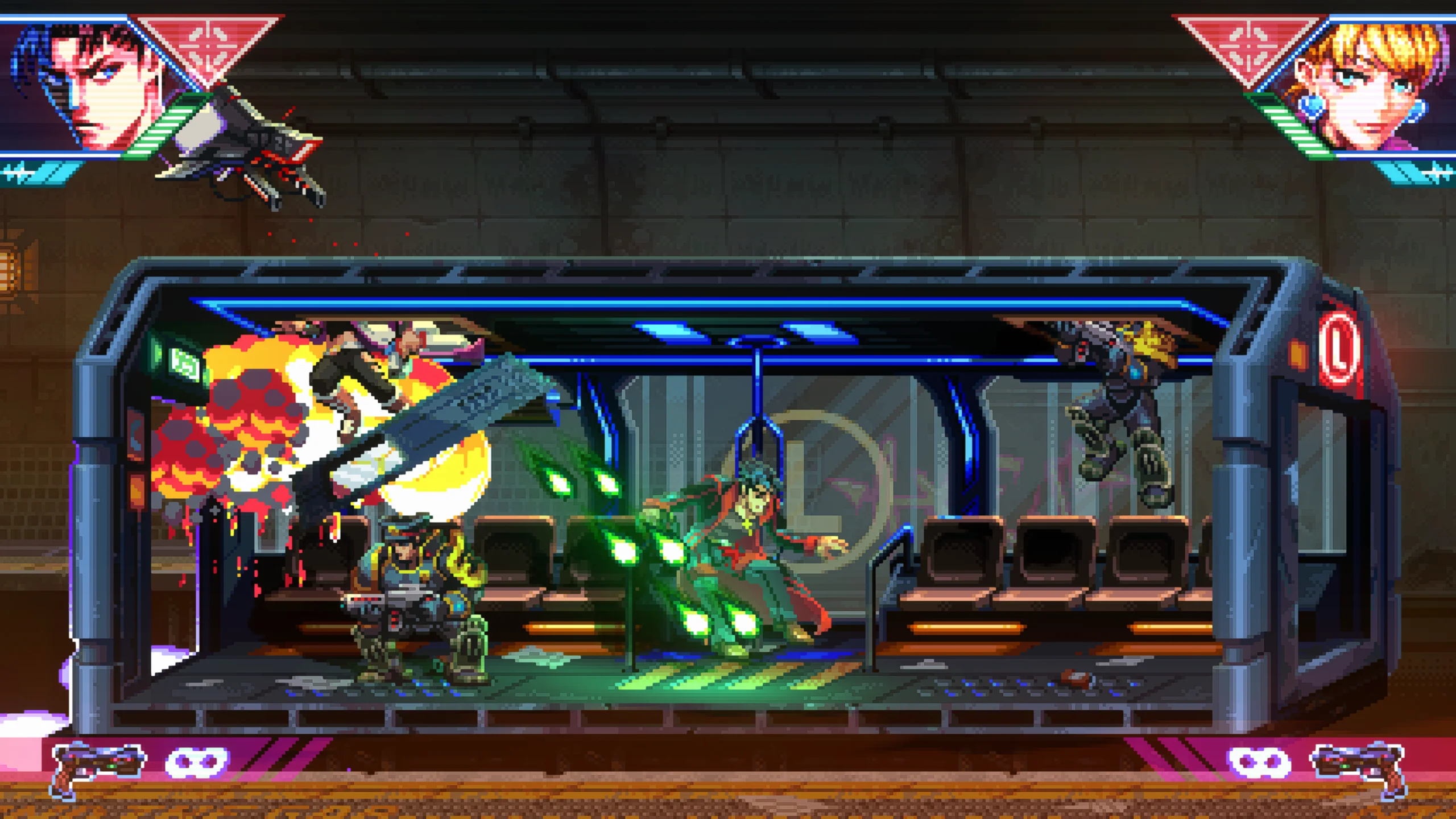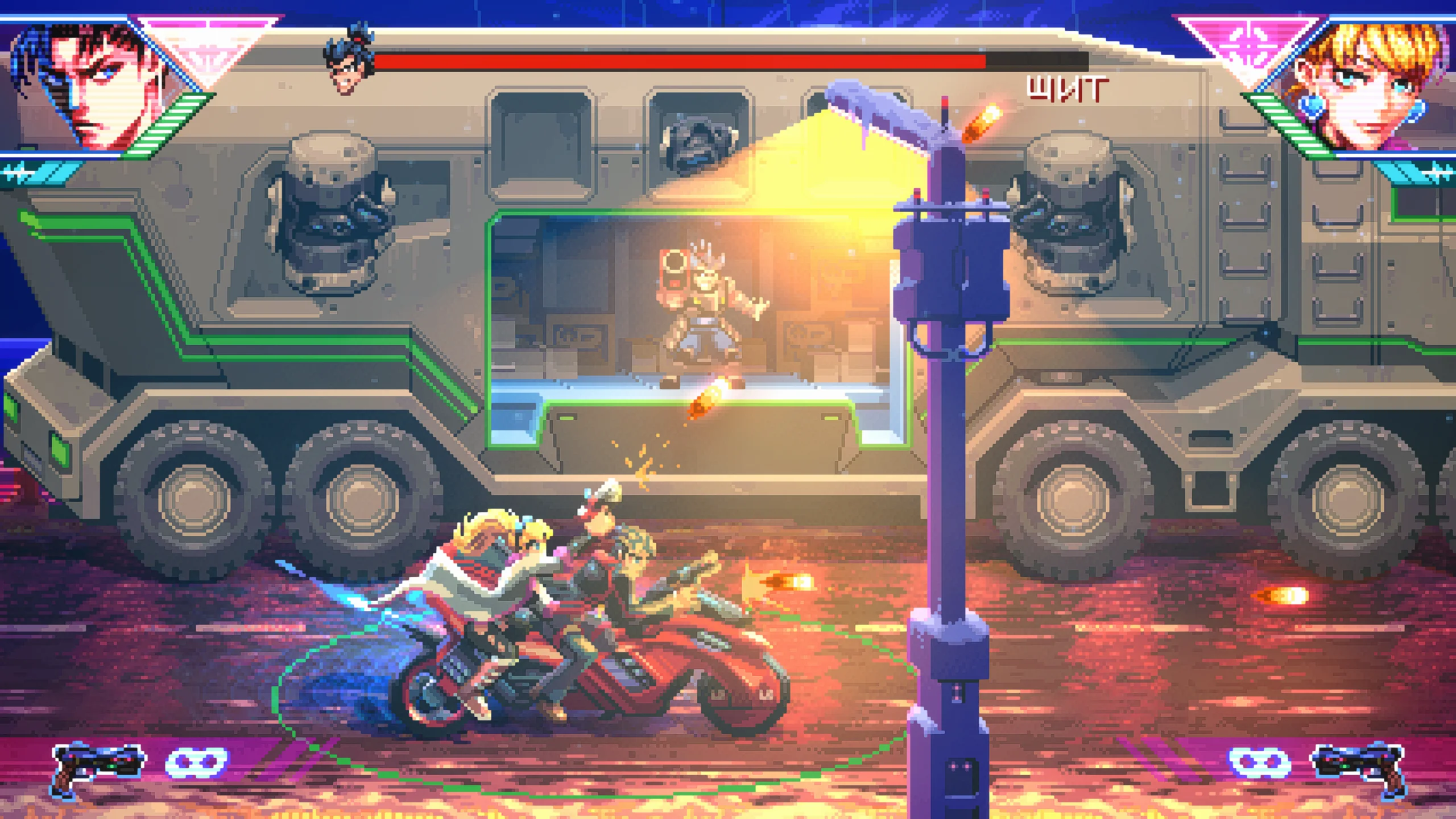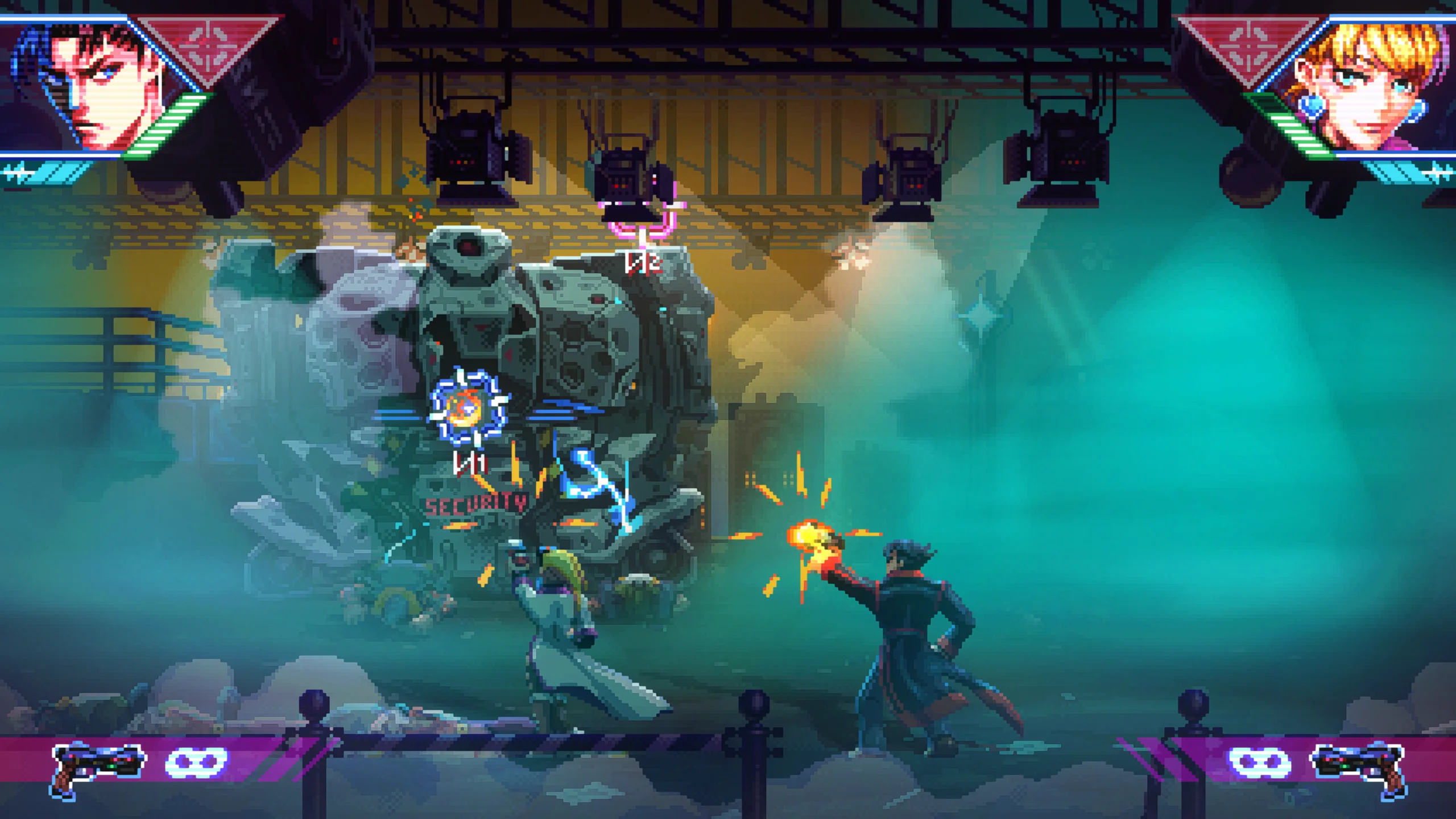 Игровой процесс сочетает классическую механику run and gun, напоминающую игры серии Contra, с элементами gallery shooter, где противники появляются как на переднем плане, так и на фоне, как в Wild Guns. Игрок может отражать вражеские выстрелы с помощью режима замедления времени и перенаправлять их обратно по целям. В некоторых миссиях можно захватывать транспорт и участвовать в динамичных погонях. Между уровнями доступны улучшения оружия и способностей, а также разные режимы сложности, включая классический аркадный вариант с одной жизнью. Игра поддерживает локальный кооператив на одной консоли для двух игроков.