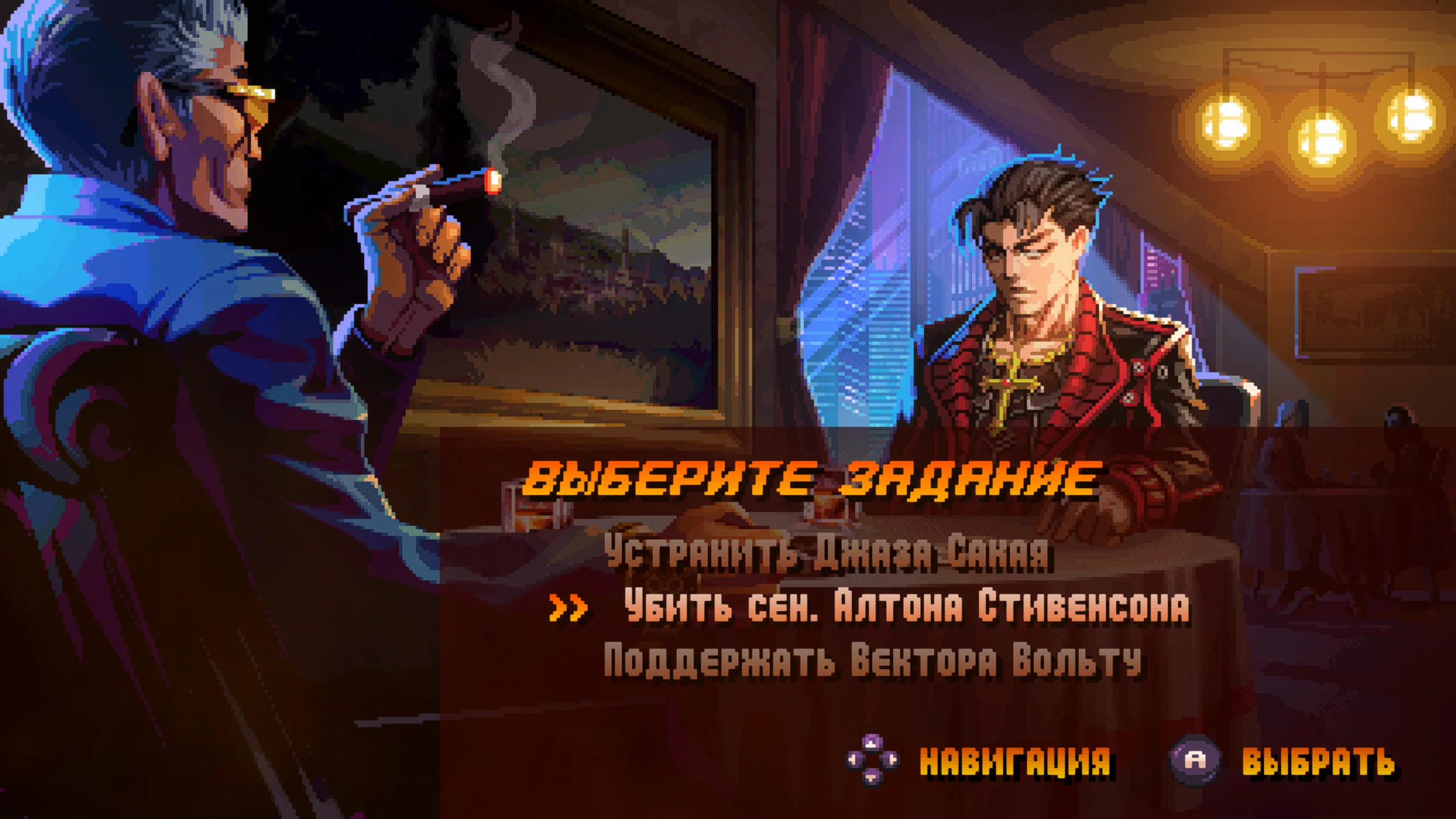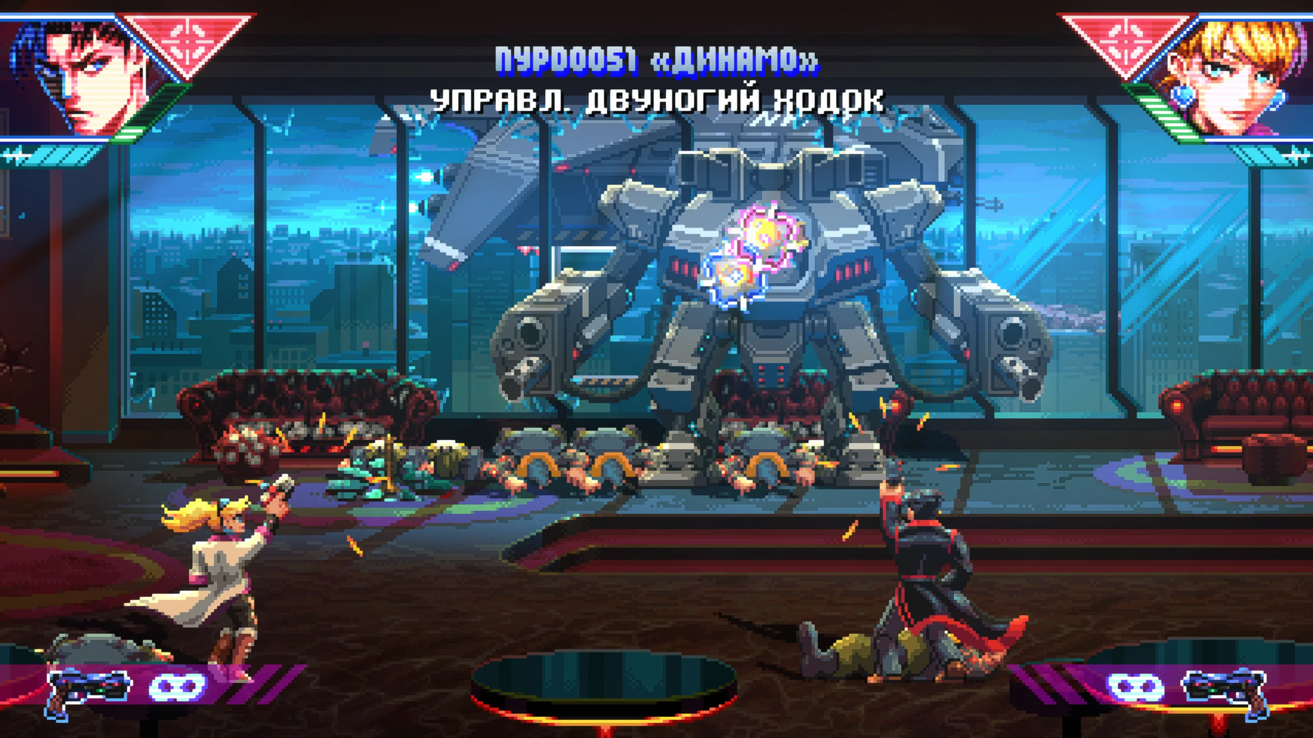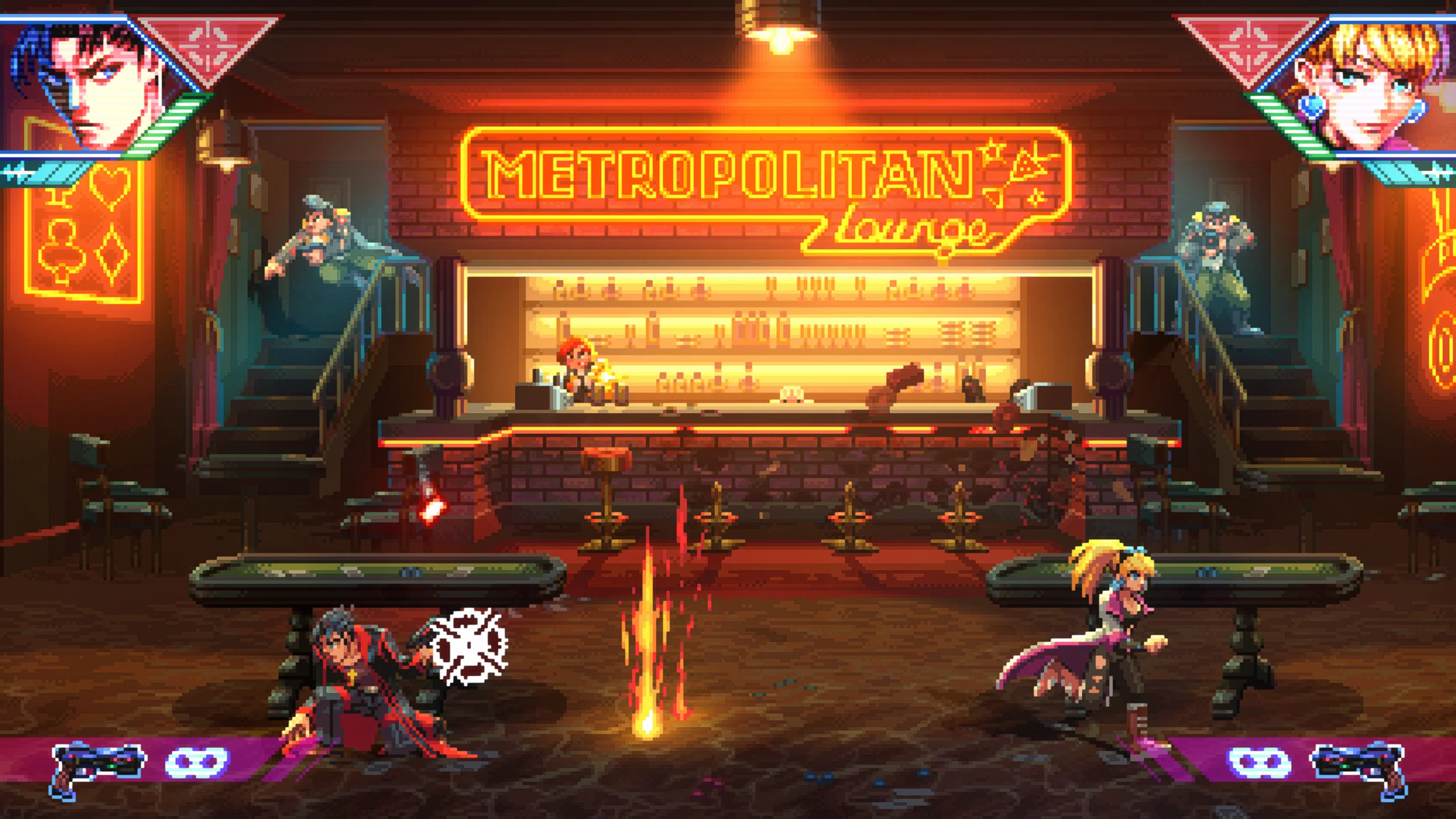 Визуальный стиль Neon Inferno основан на пиксельной графике с яркими неоновыми оттенками. Атмосфера напоминает фильмы вроде «Бегущего по лезвию» и передает мрачный облик киберпанкового будущего. Дизайн уровней варьируется: городские улицы, подпольные базы, ночные клубы и другие локации выполнены детально и оживают благодаря динамичным фонам. Музыкальное оформление насыщено электронными мотивами в духе ретро, а звуки стрельбы и взрывов усиливают напряжение боевых сцен.