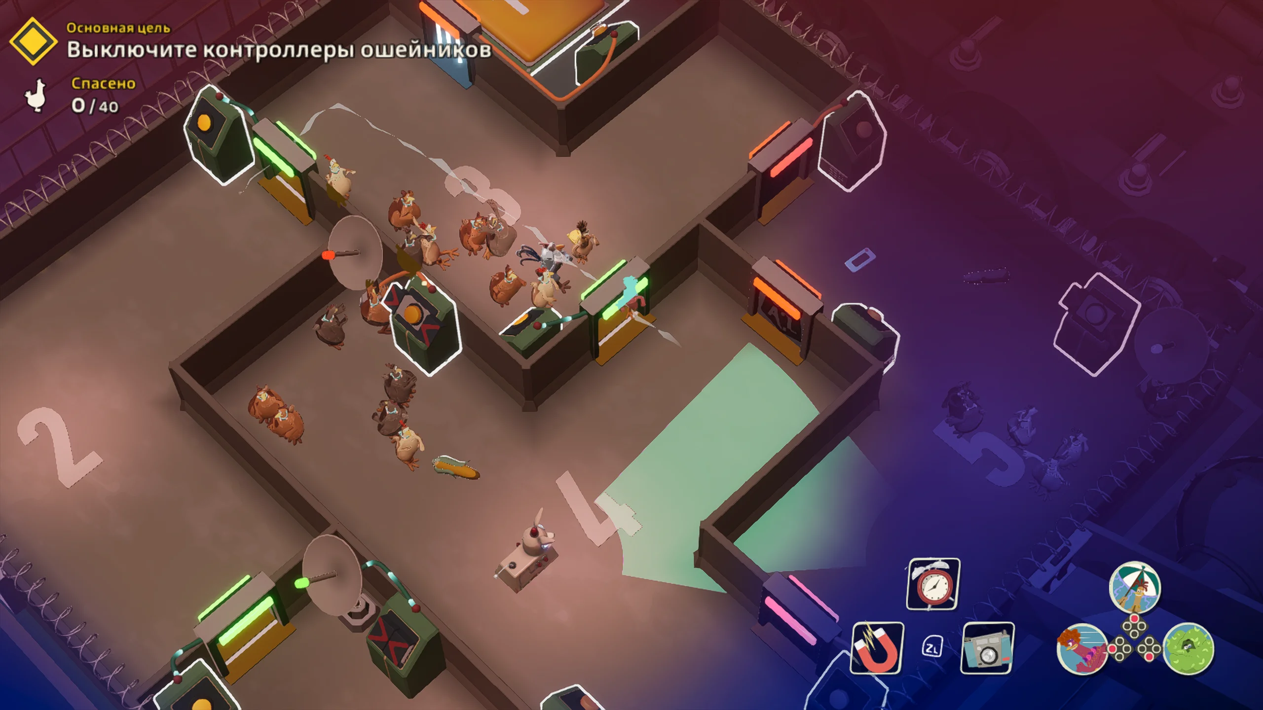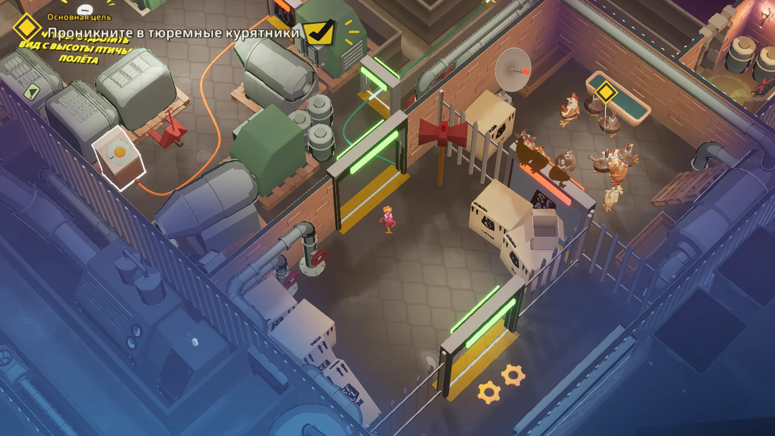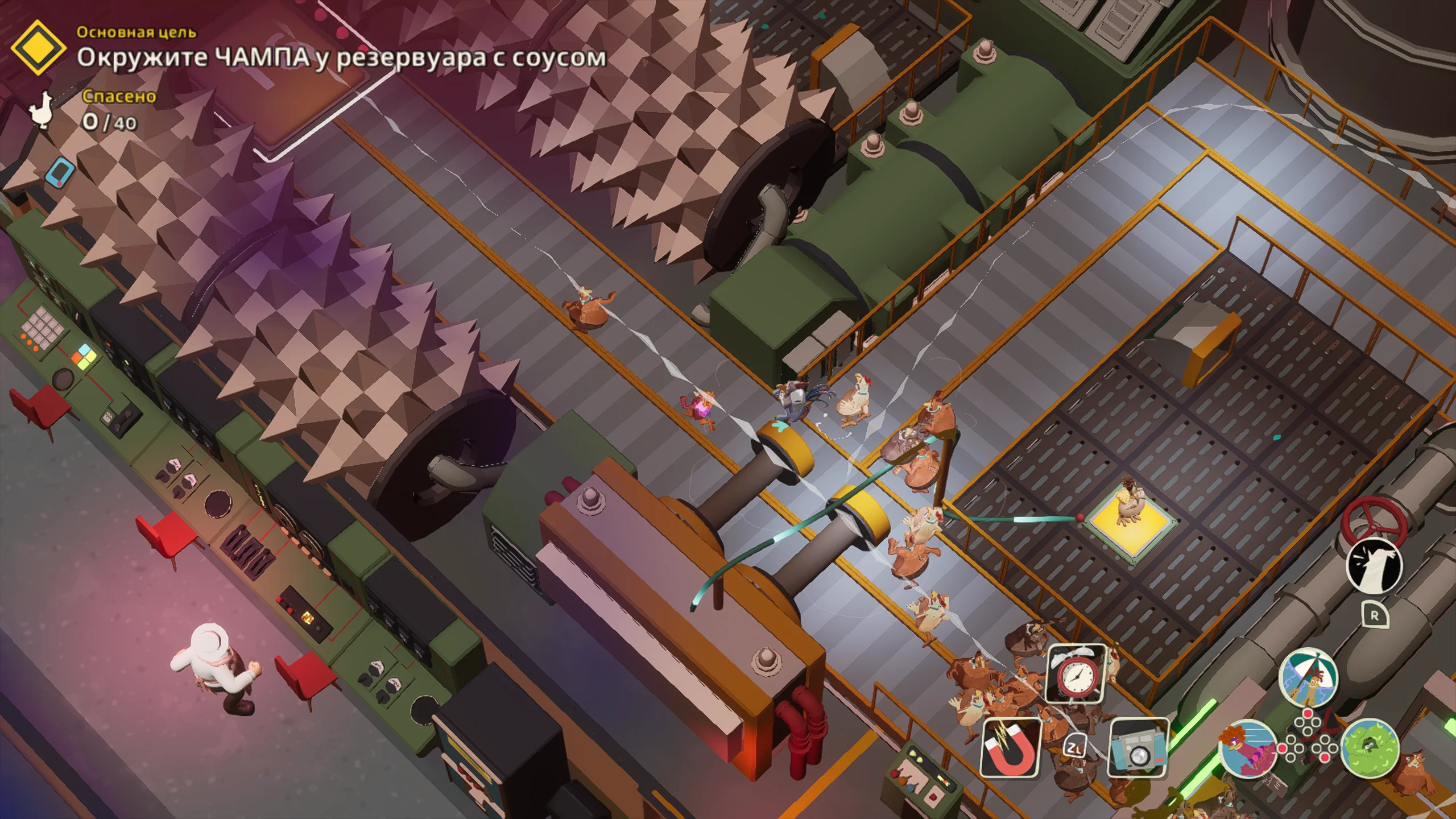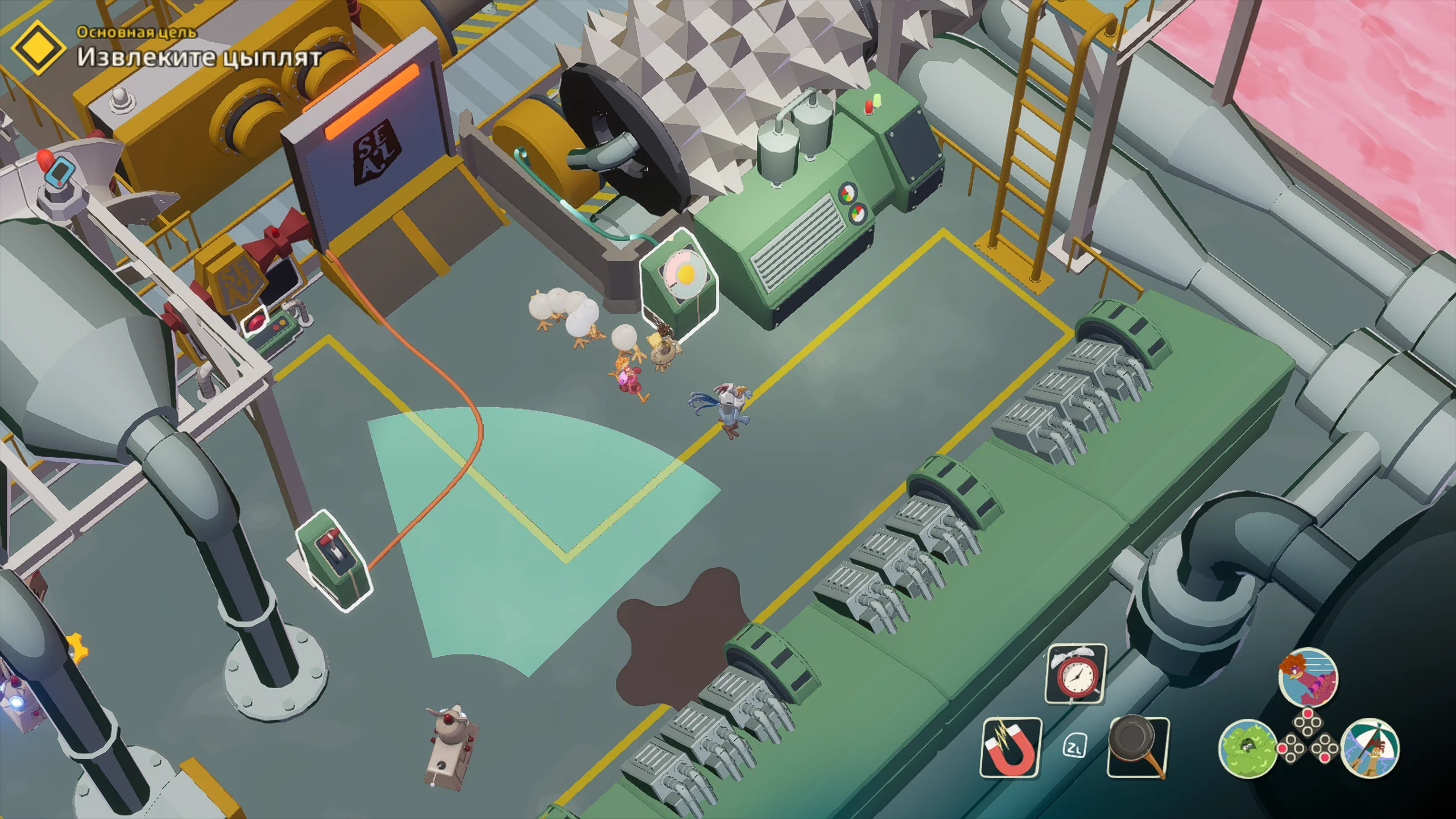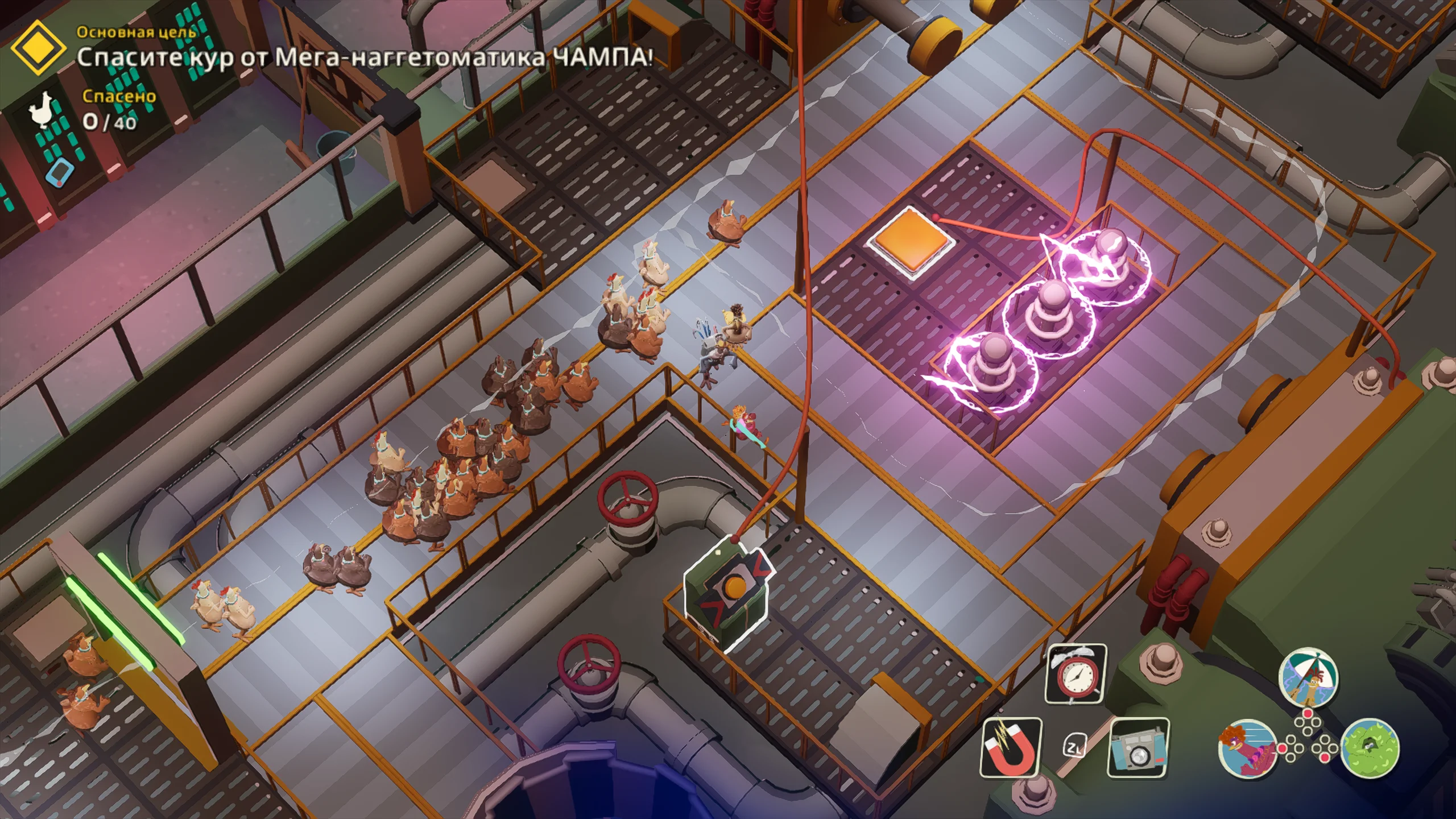 Игровая система основана на механике скрытного продвижения с камерой сверху. Основная задача состоит в том, чтобы передвигаться незаметно, отвлекать противников, саботировать оборудование и выносить яйца. Игрок формирует собственный отряд кур, в который входят Молли, Рокки, Фриззл и другие персонажи, каждый со своей специализацией. Одни лучше справляются с отвлекающими манёврами, другие быстрее собирают ресурсы, а третьи устанавливают устройства для диверсий. Кооперативный режим позволяет распределять роли и выполнять задания более продуманно.