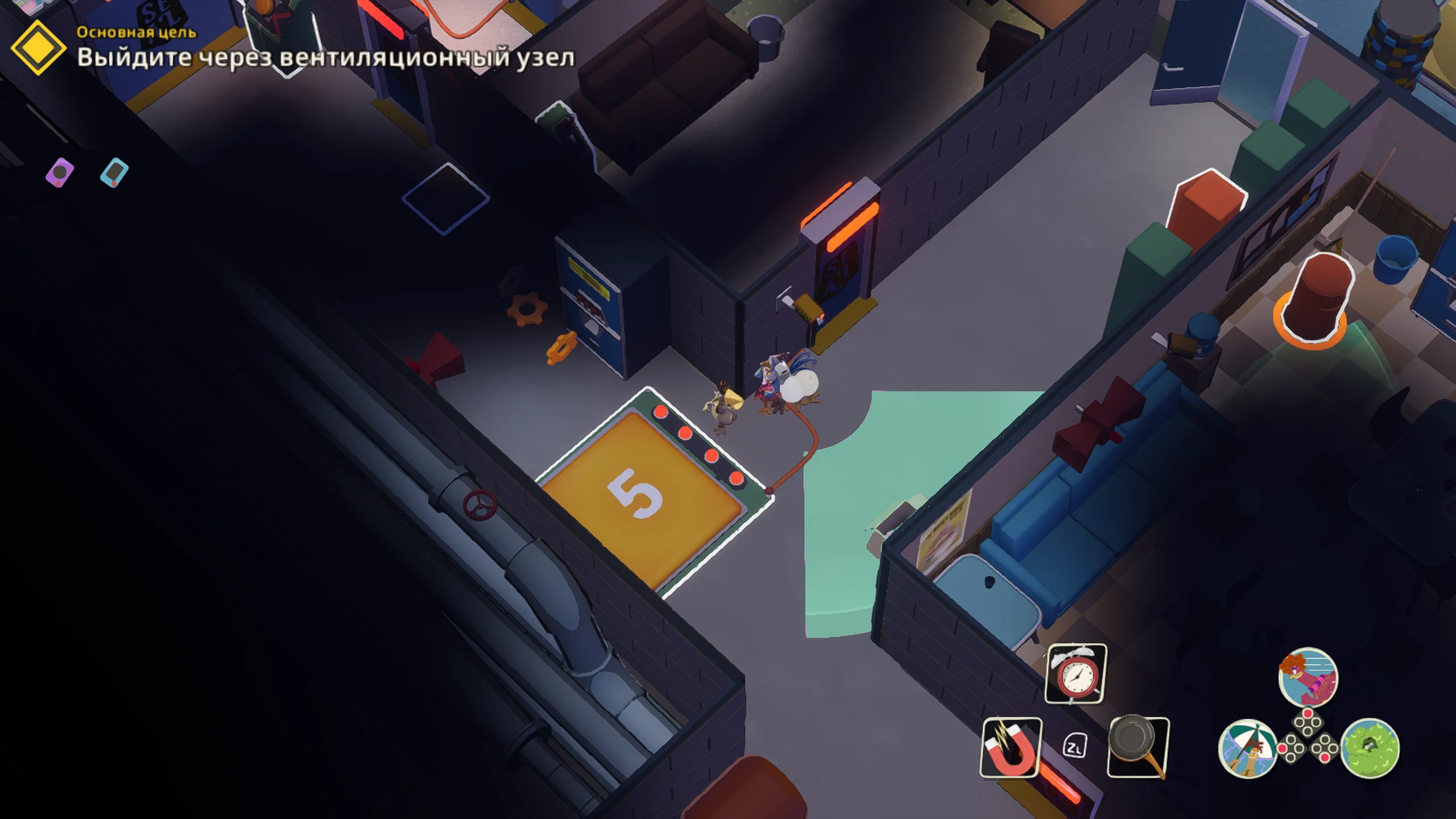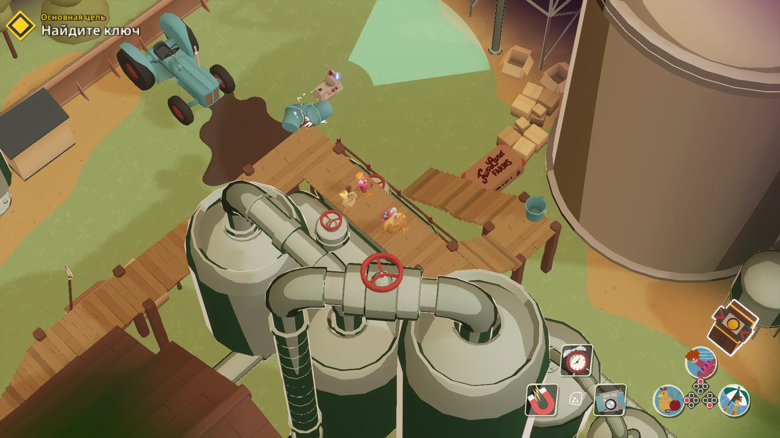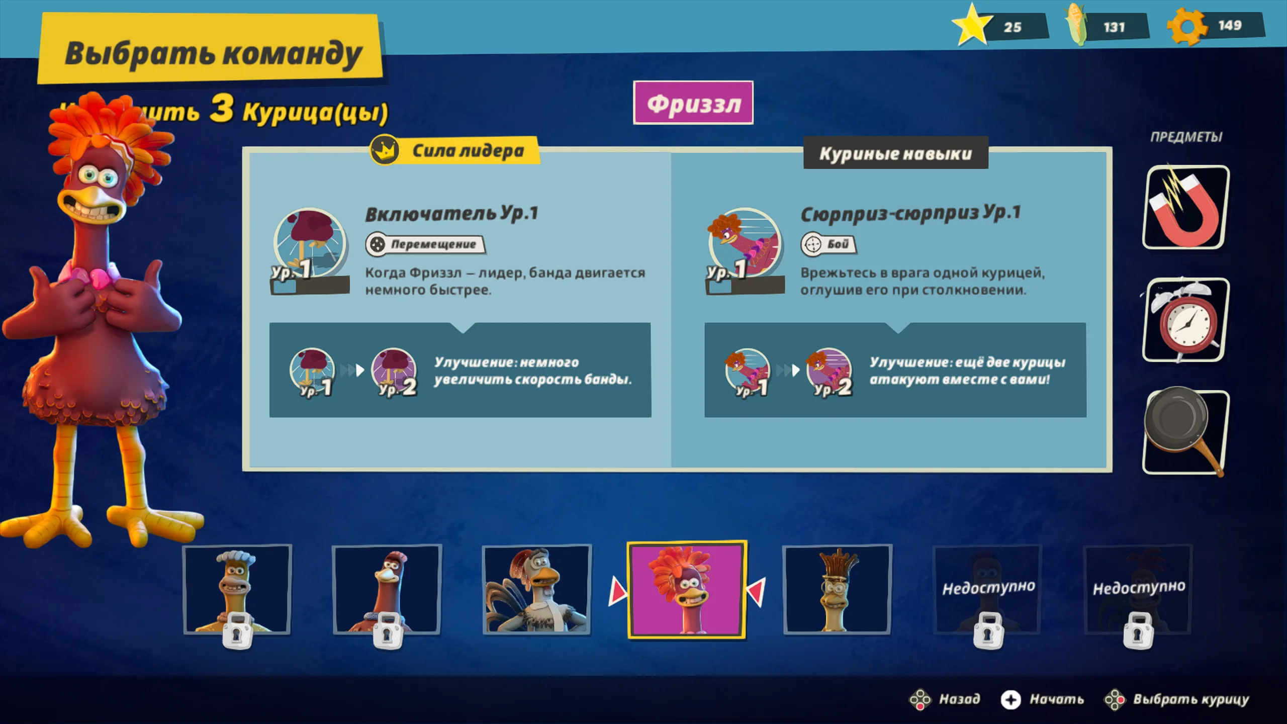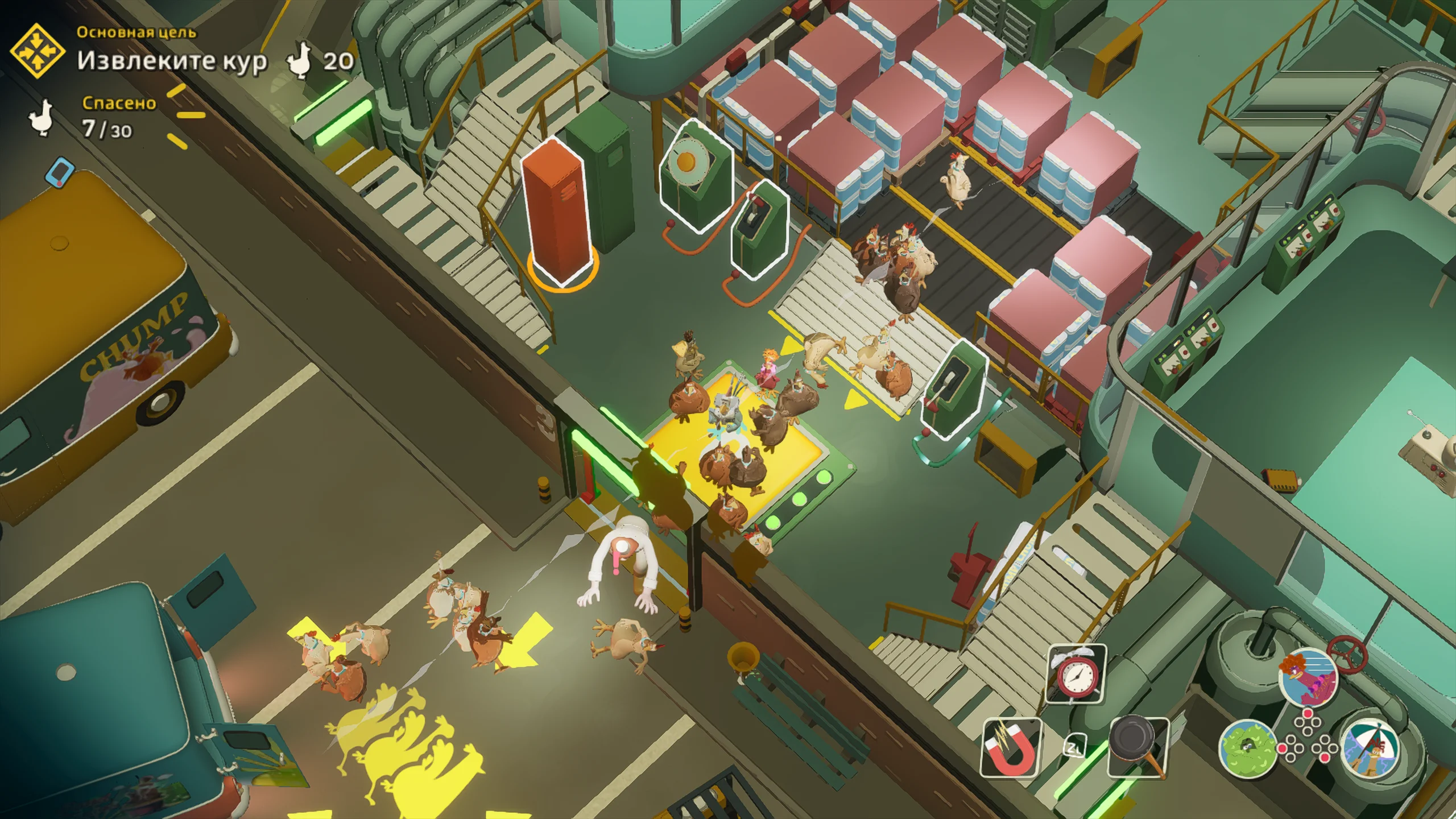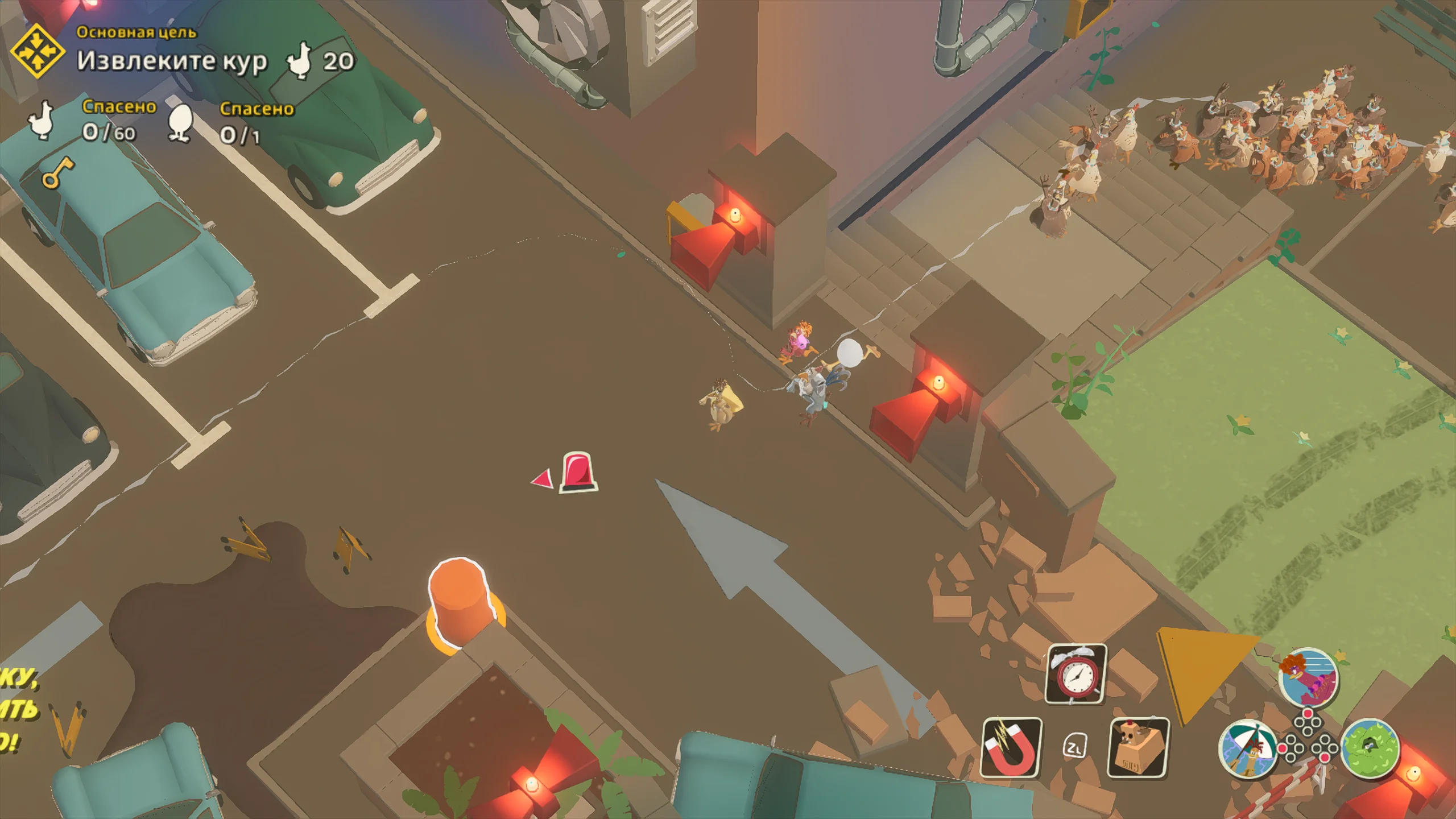 Игровая система основана на механике скрытного продвижения с камерой сверху. Основная задача состоит в том, чтобы передвигаться незаметно, отвлекать противников, саботировать оборудование и выносить яйца. Игрок формирует собственный отряд кур, в который входят Молли, Рокки, Фриззл и другие персонажи, каждый со своей специализацией. Одни лучше справляются с отвлекающими манёврами, другие быстрее собирают ресурсы, а третьи устанавливают устройства для диверсий. Кооперативный режим позволяет распределять роли и выполнять задания более продуманно.