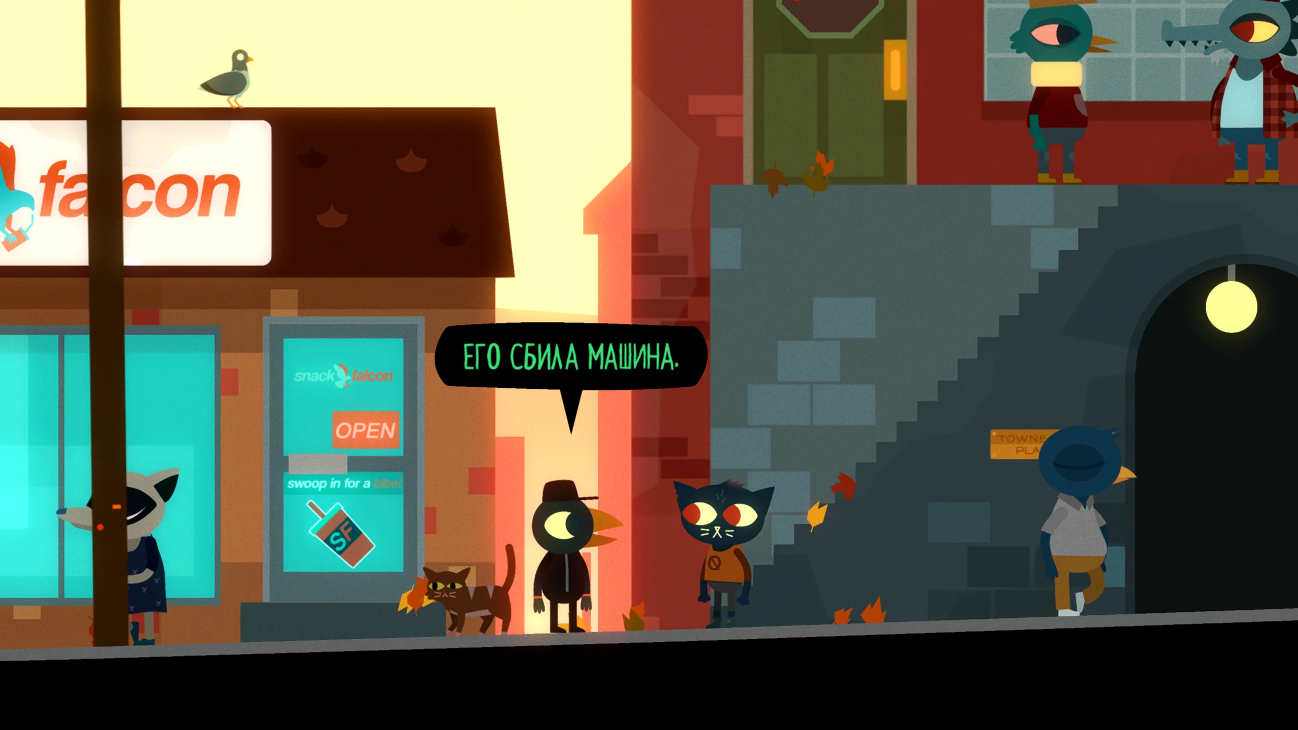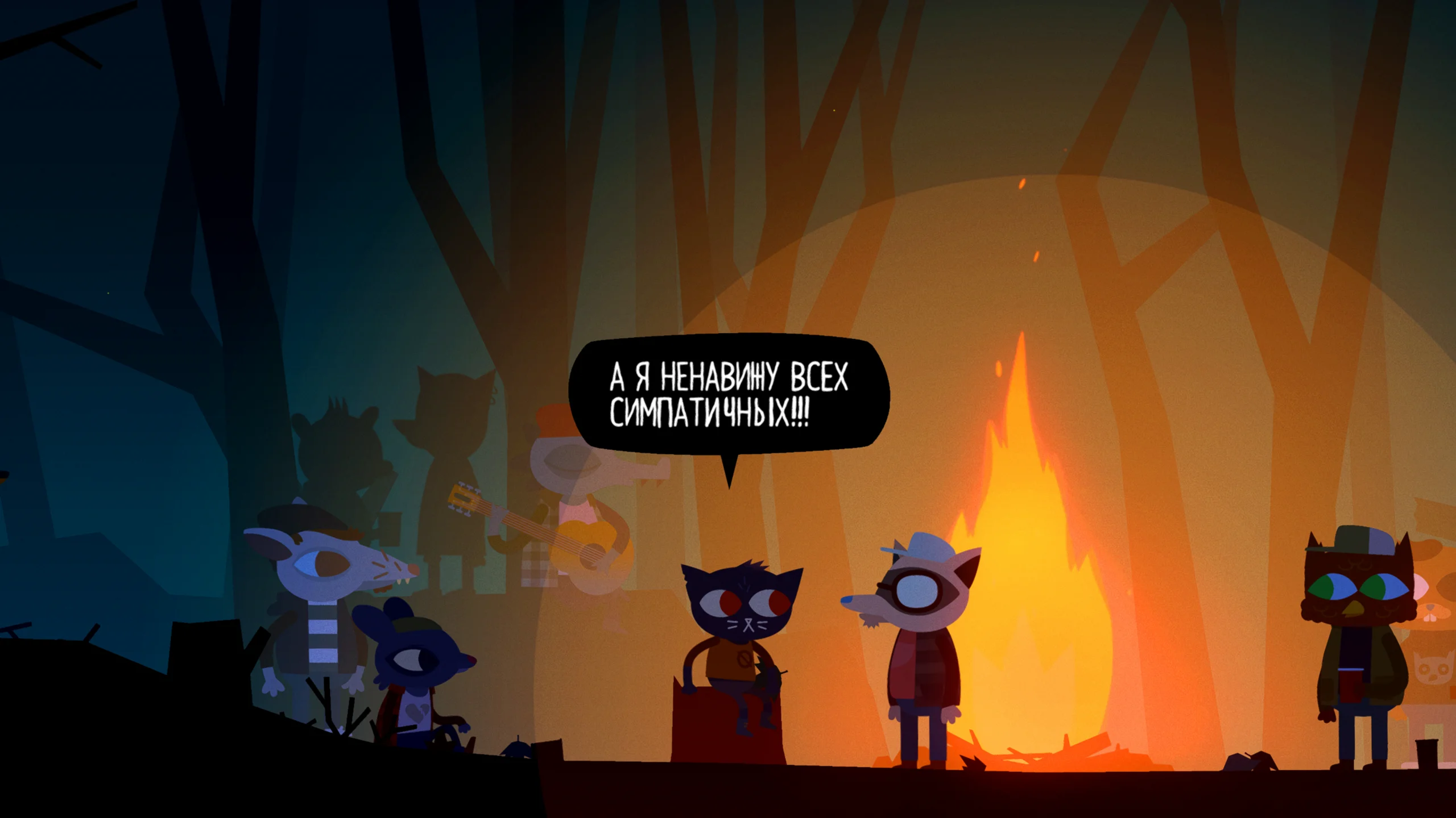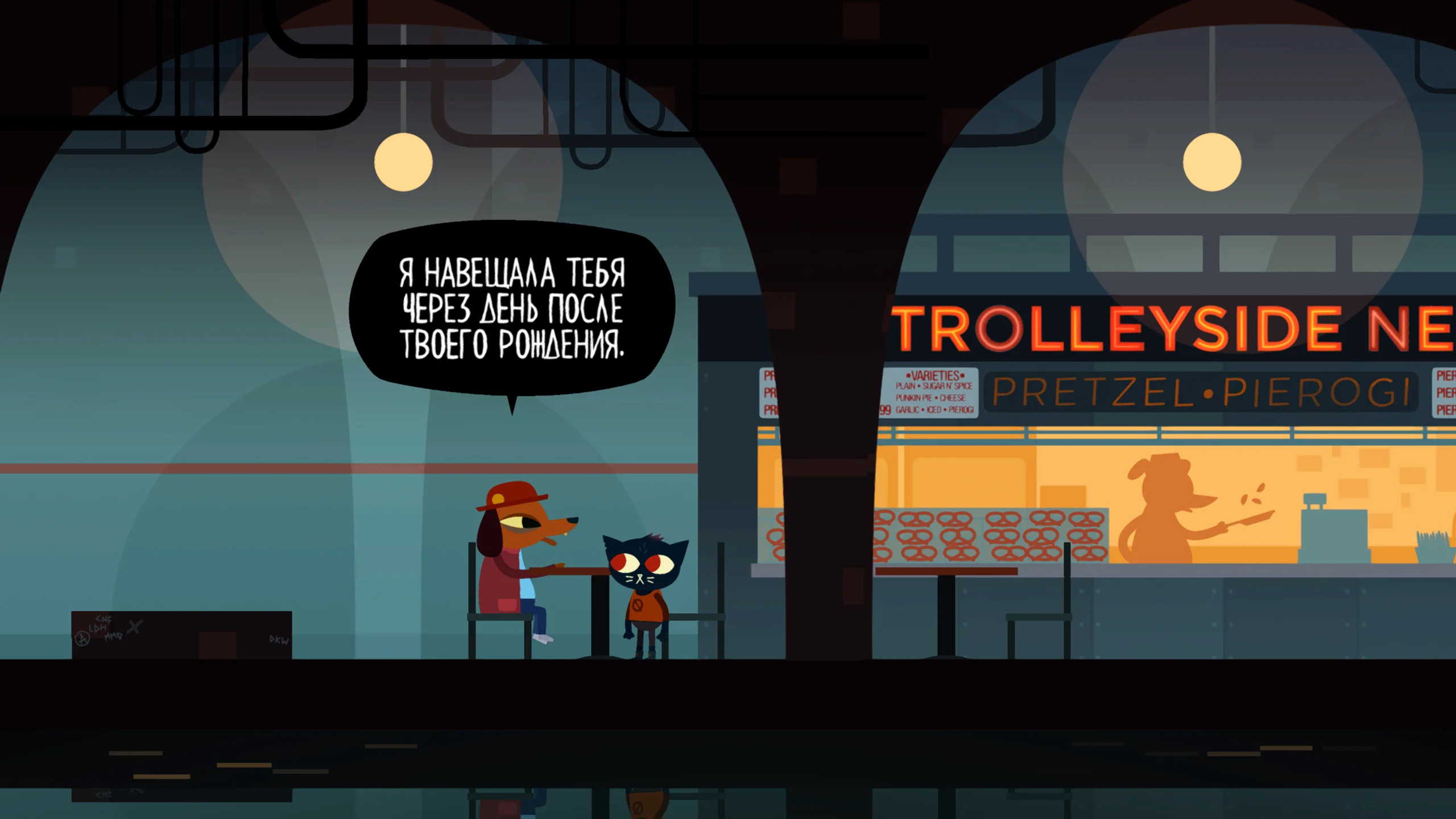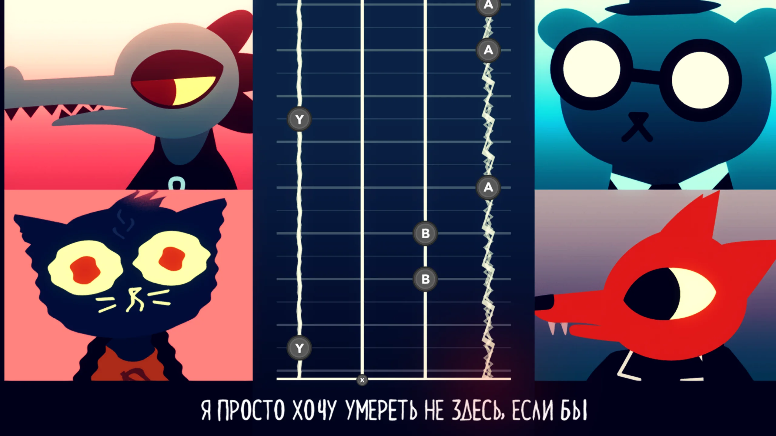 Night in the Woods выполнена в стилизованной двумерной графике, где персонажи и окружение напоминают мультяшные рисунки с яркой палитрой и выразительной анимацией. Такой визуальный подход подчёркивает эмоциональную глубину сюжета и передаёт неповторимую атмосферу маленького американского городка. Музыкальное сопровождение идеально дополняет настроение игры: от задумчивых и меланхоличных композиций до ритмичных мелодий во время мини-игр, усиливая ключевые моменты повествования.