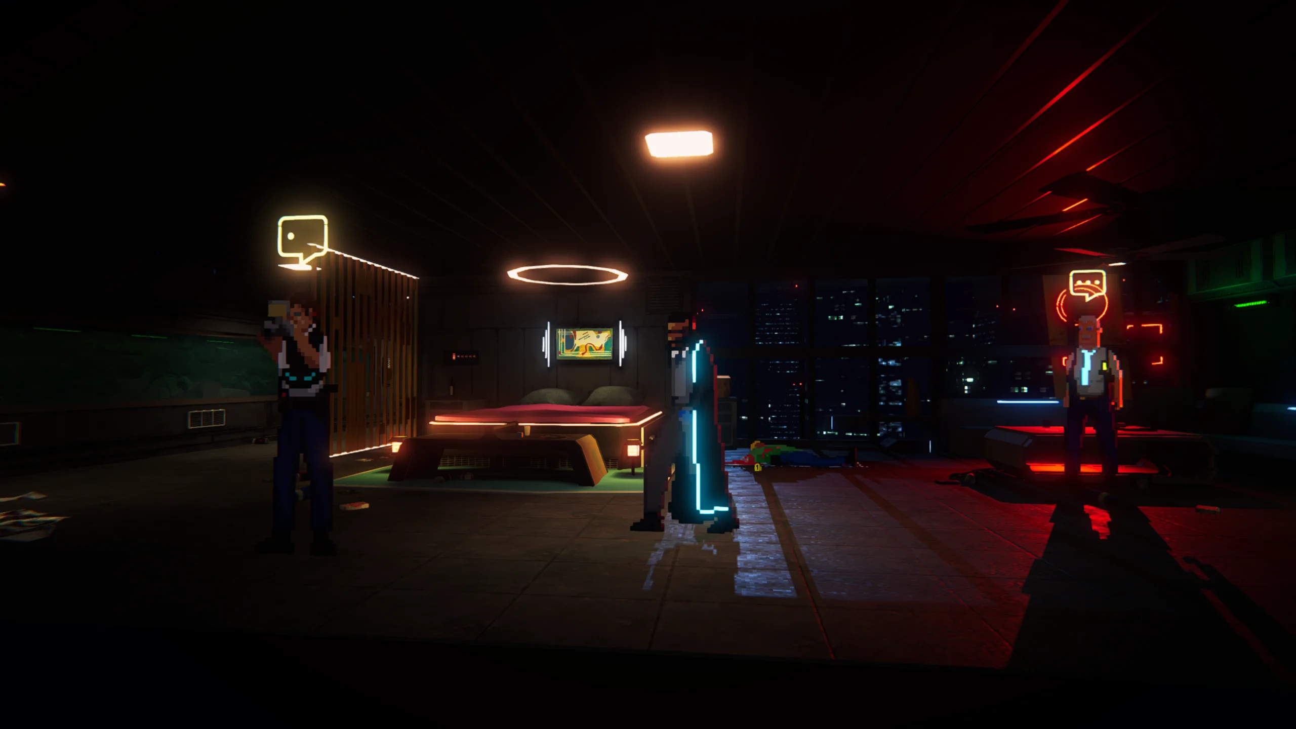 Визуально Neon Blood выполнена в стилистике 2.5D, сочетающей пиксельную графику персонажей с трёхмерными окружениями. Такой подход формирует выразительную атмосферу ретрофутуризма и научной фантастики. Дизайн локаций подчёркивает контраст между сияющим Bright City и опасным Blind City, а ночные сцены, наполненные неоновым светом, усиливают ощущение антиутопического мира. Музыкальное сопровождение и звуковые эффекты поддерживают напряжённое настроение расследований и драматических сюжетных моментов.