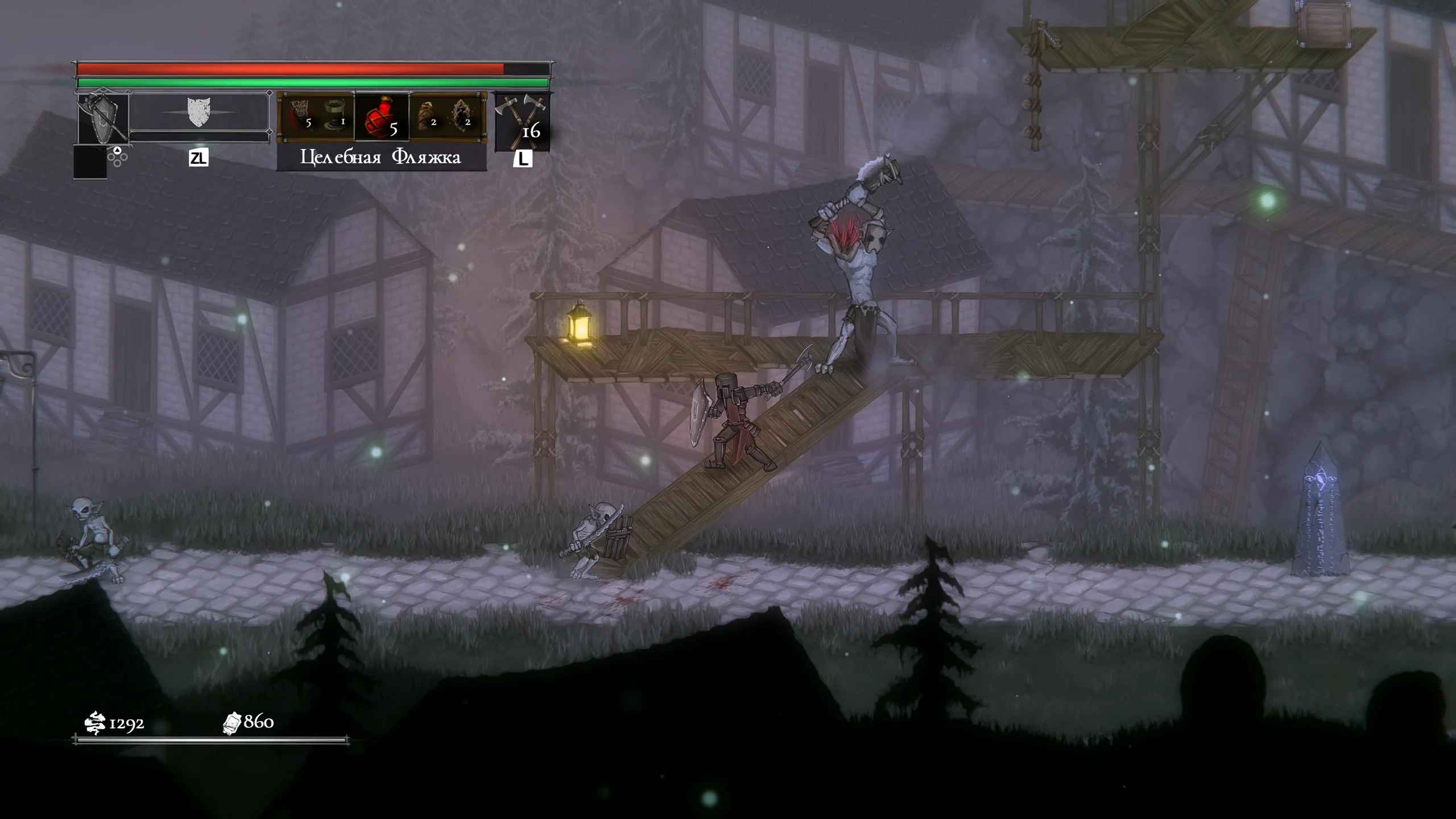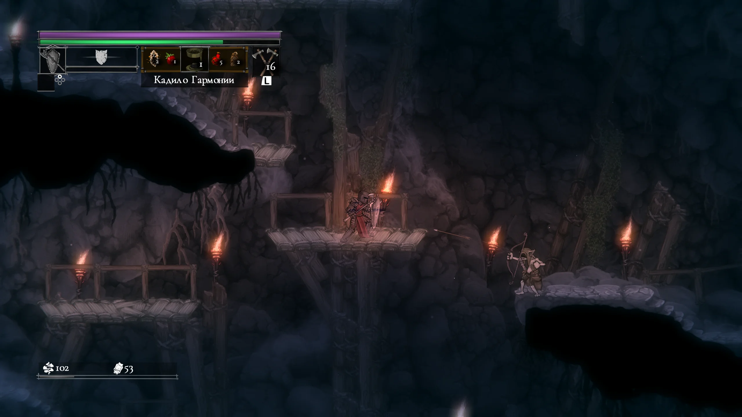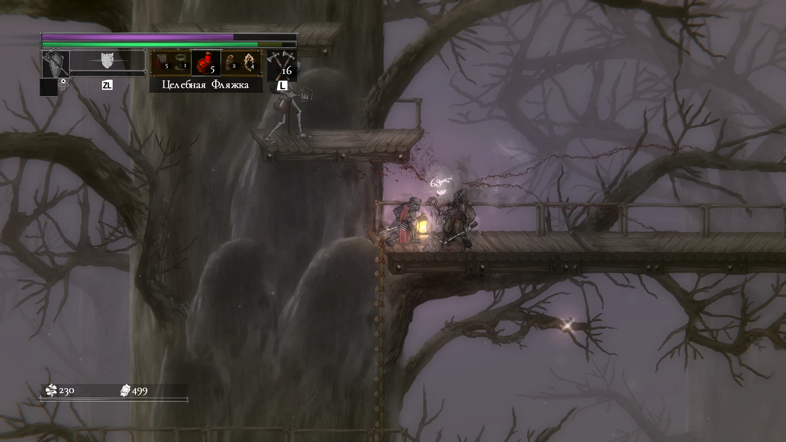 Визуально игра выполнена в мрачной рисованной двумерной графике с детализированными персонажами и окружением. Локации включают разрушенные крепости, леса и руины, передающие атмосферу упадка и постоянной угрозы. Анимации боёв подчёркивают тяжесть ударов и динамику схваток, а музыкальное сопровождение и звуковые эффекты усиливают напряжение и драматизм происходящего.