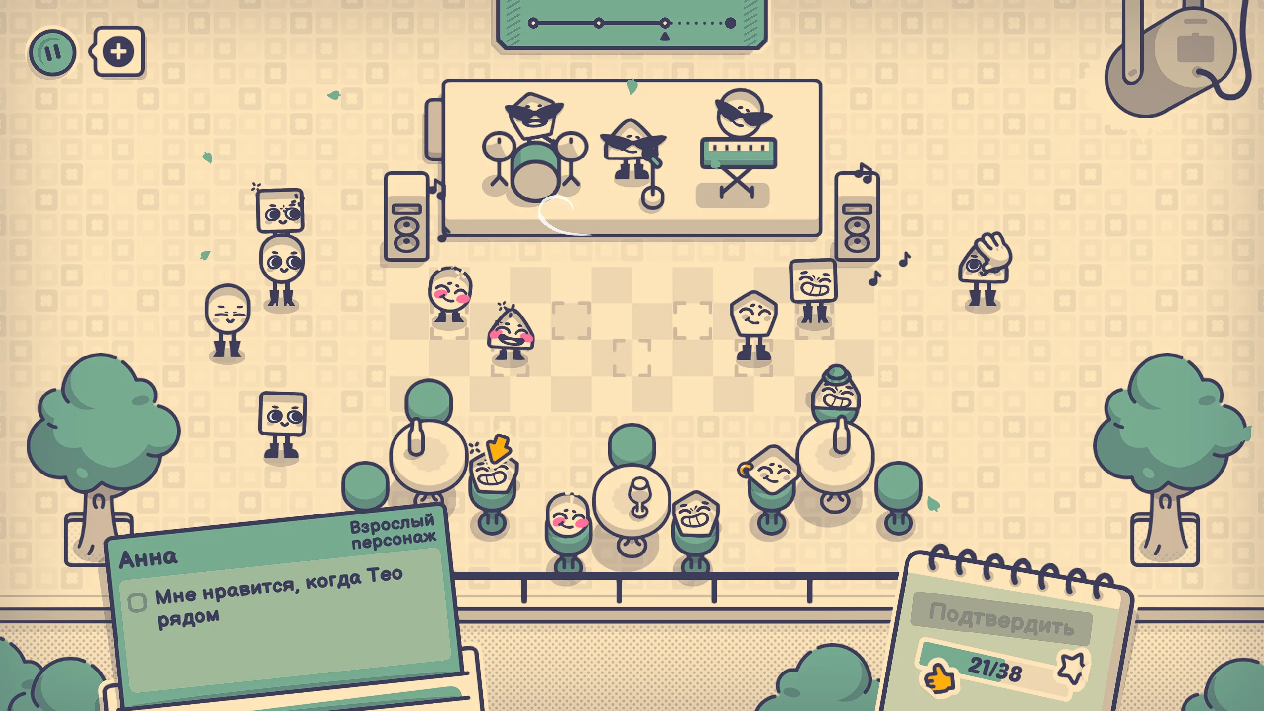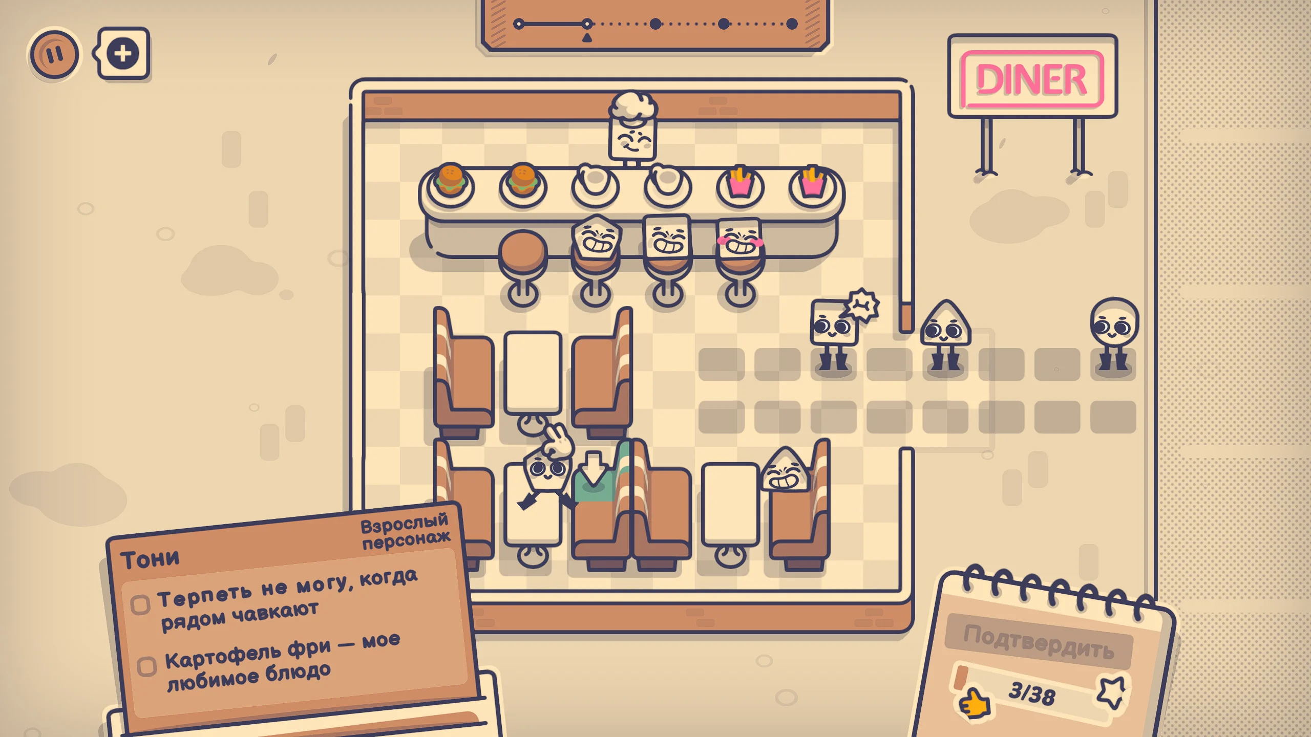 Игровой процесс основан на решении головоломок, связанных с размещением персонажей. Игроку необходимо рассаживать людей таким образом, чтобы учитывать их индивидуальные требования и избегать конфликтов. Каждый персонаж обладает уникальными чертами, влияющими на оптимальное решение задачи, что требует анализа и экспериментирования. По мере прохождения уровни усложняются, вводя новые условия и типы взаимодействий, расширяющие вариативность решений.