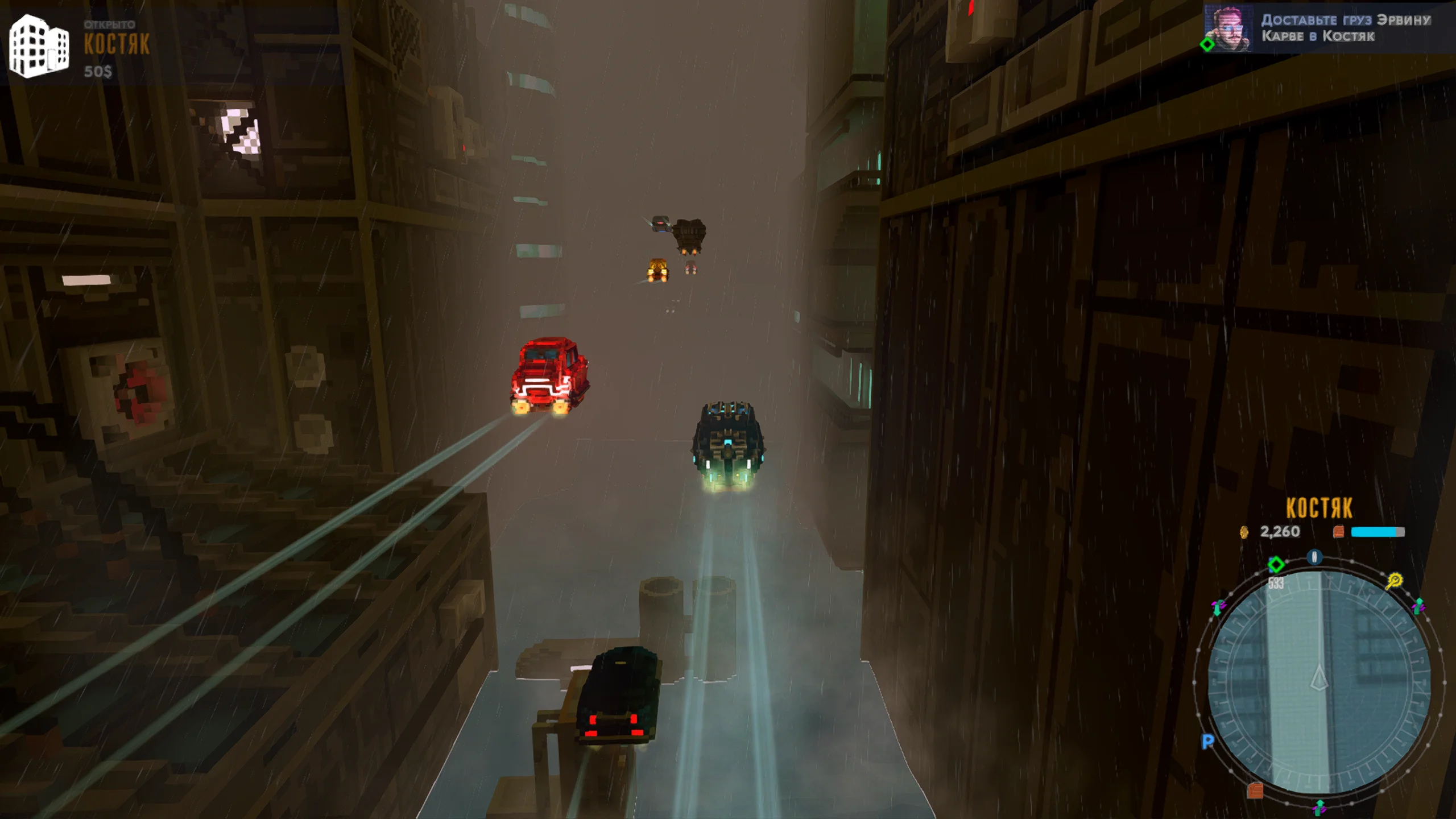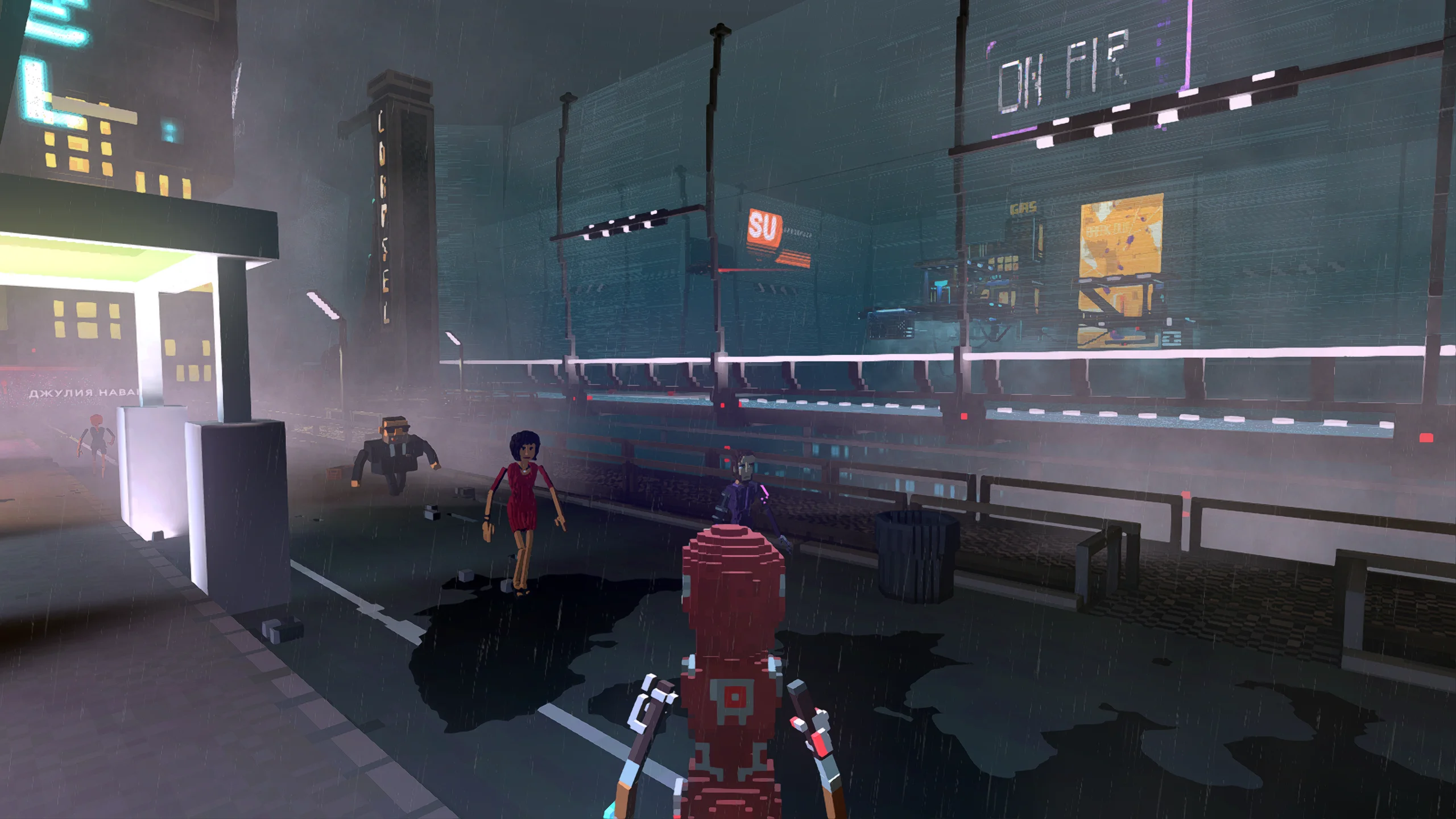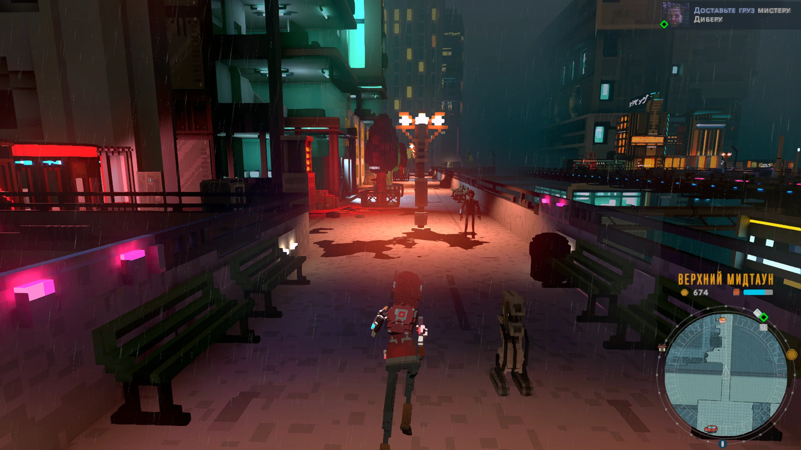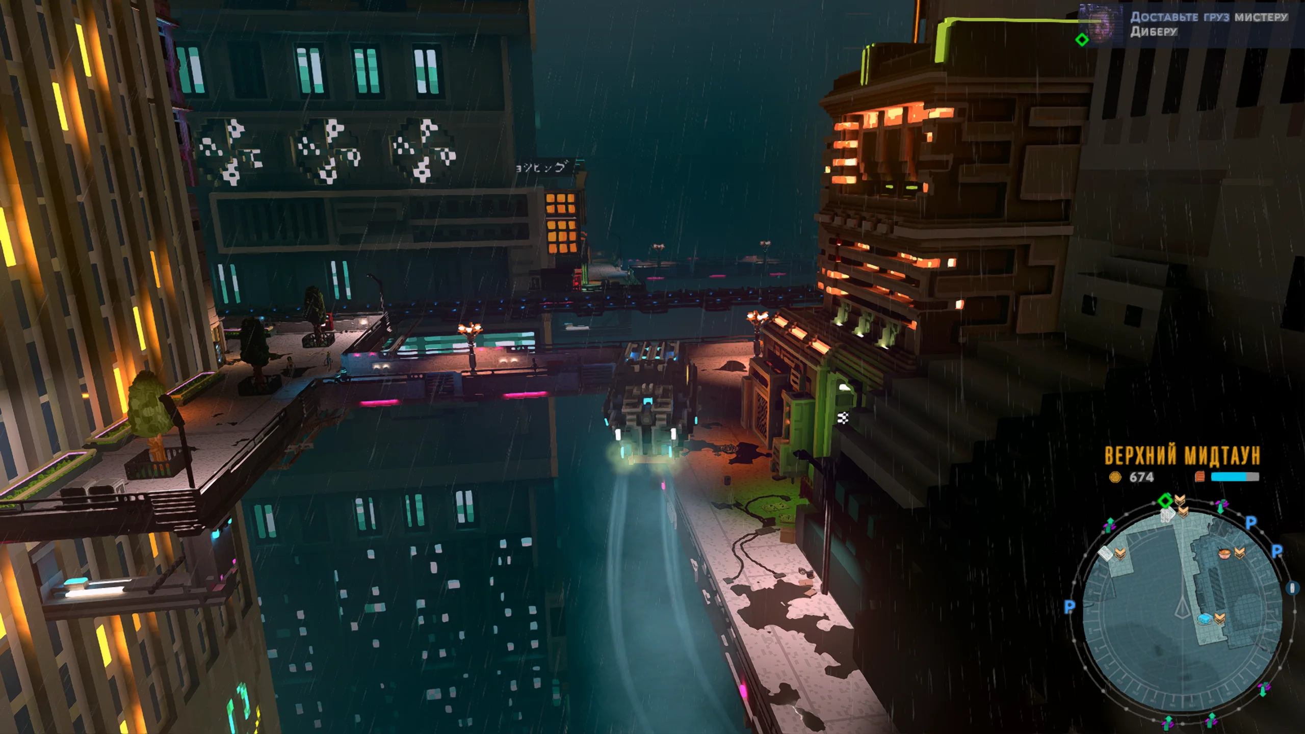 Визуально игра выполнена в стилизованной воксельной графике с ярким неоновым освещением, передающим атмосферу киберпанка. Город представлен многоуровневым пространством с разнообразными районами, от индустриальных зон до элитных кварталов. Музыкальное сопровождение сочетает электронные композиции с атмосферными треками, усиливая ощущение погружения в ночной мегаполис, а звуковые эффекты подчёркивают движение транспорта и особенности окружения.