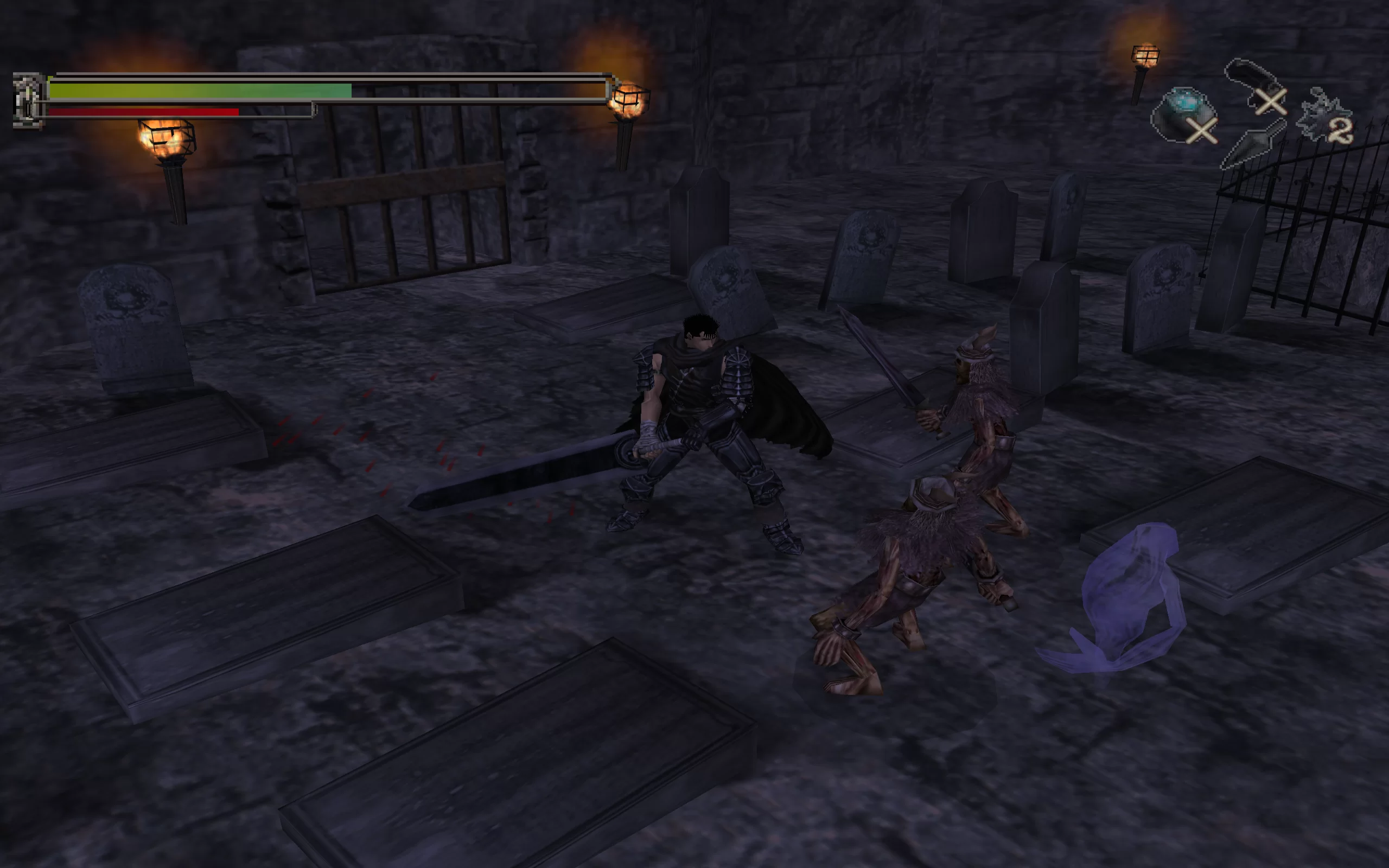 Графическое исполнение Sword of the Berserk: Guts' Rage для Sega Dreamcast впечатляет своей детализацией и атмосферностью. Игра использует мощные возможности консоли для создания реалистичных и мрачных локаций, а также детализированных моделей персонажей. Анимация боевых сцен выполнена на высоком уровне, передавая всю жестокость и интенсивность сражений.