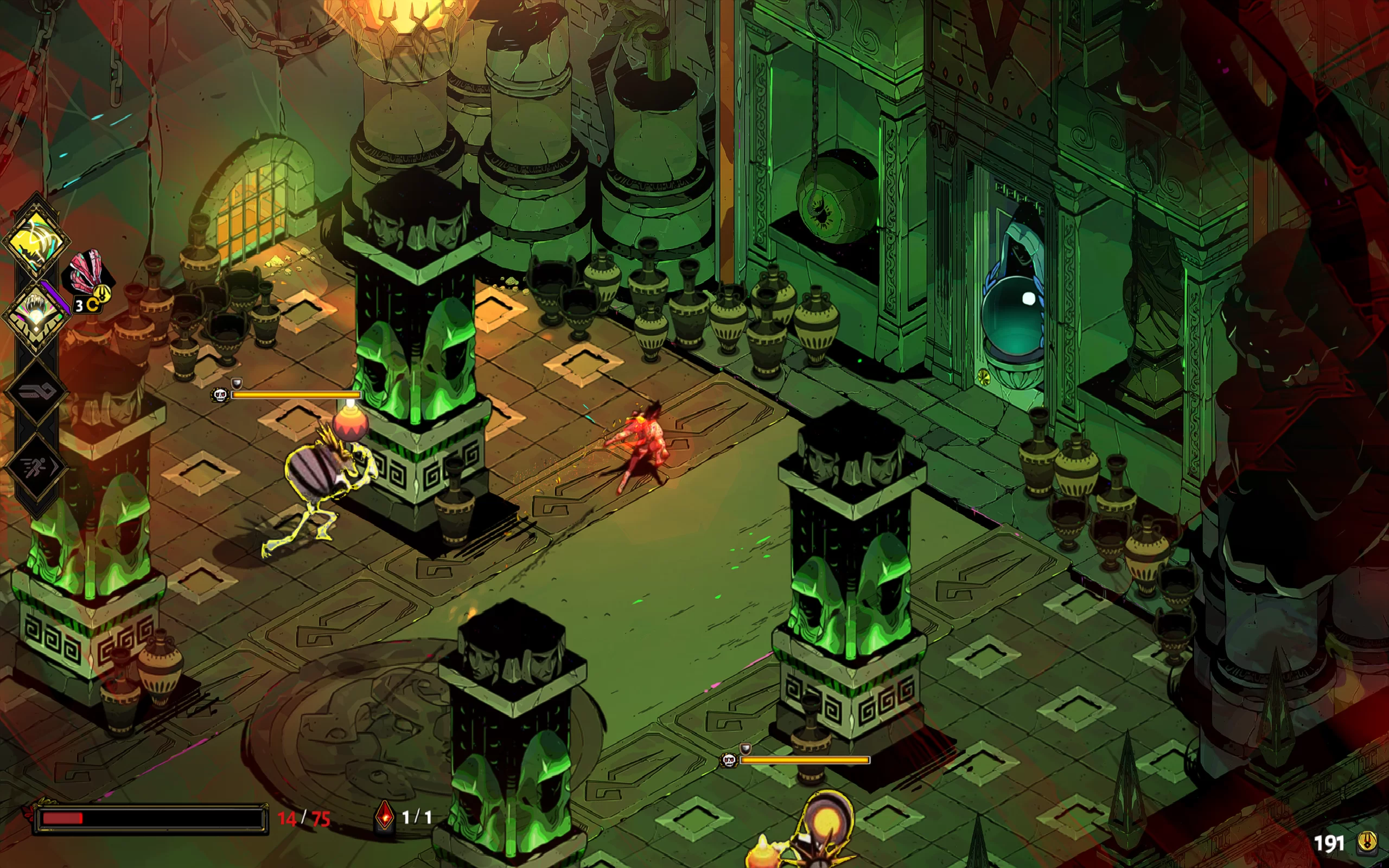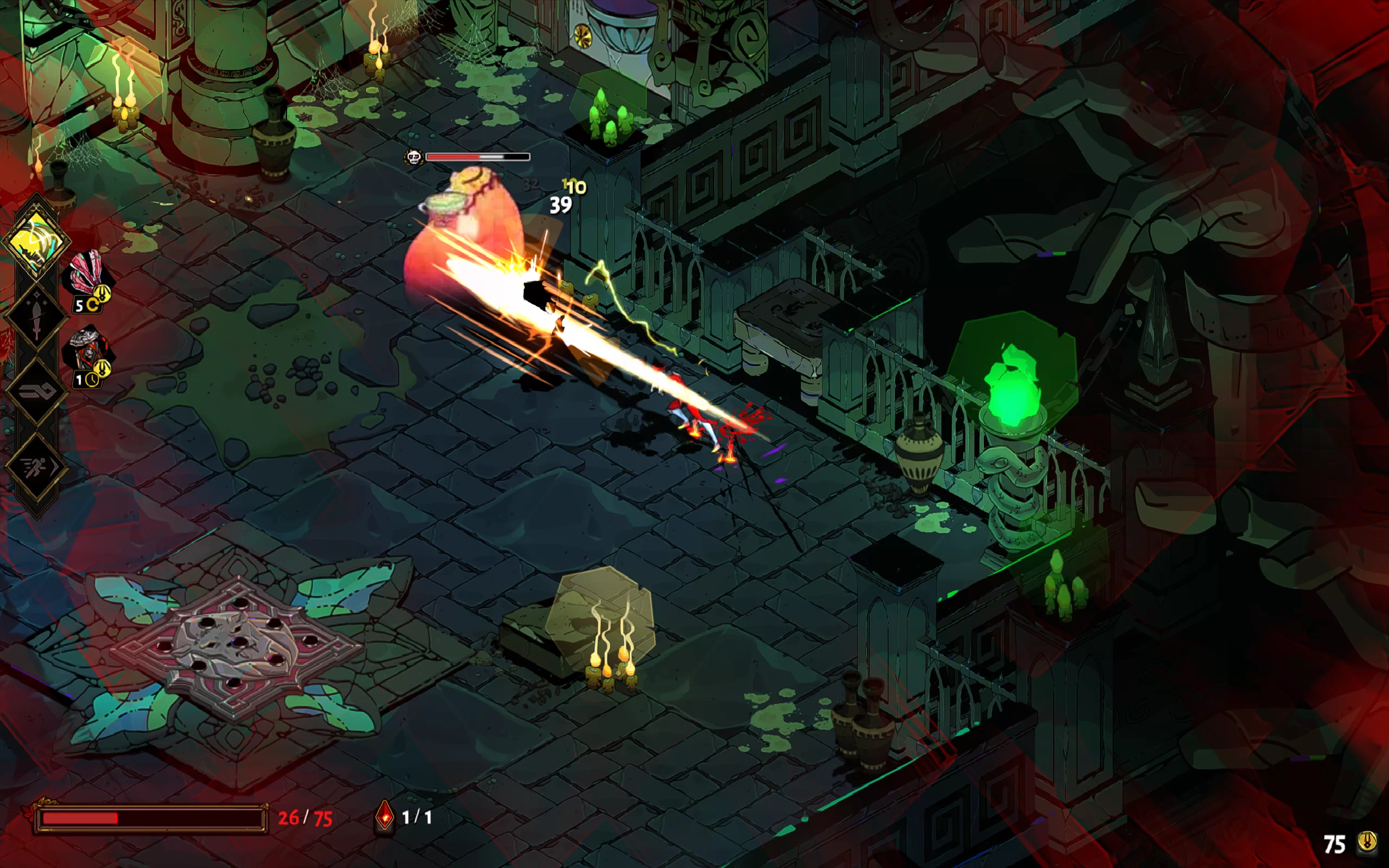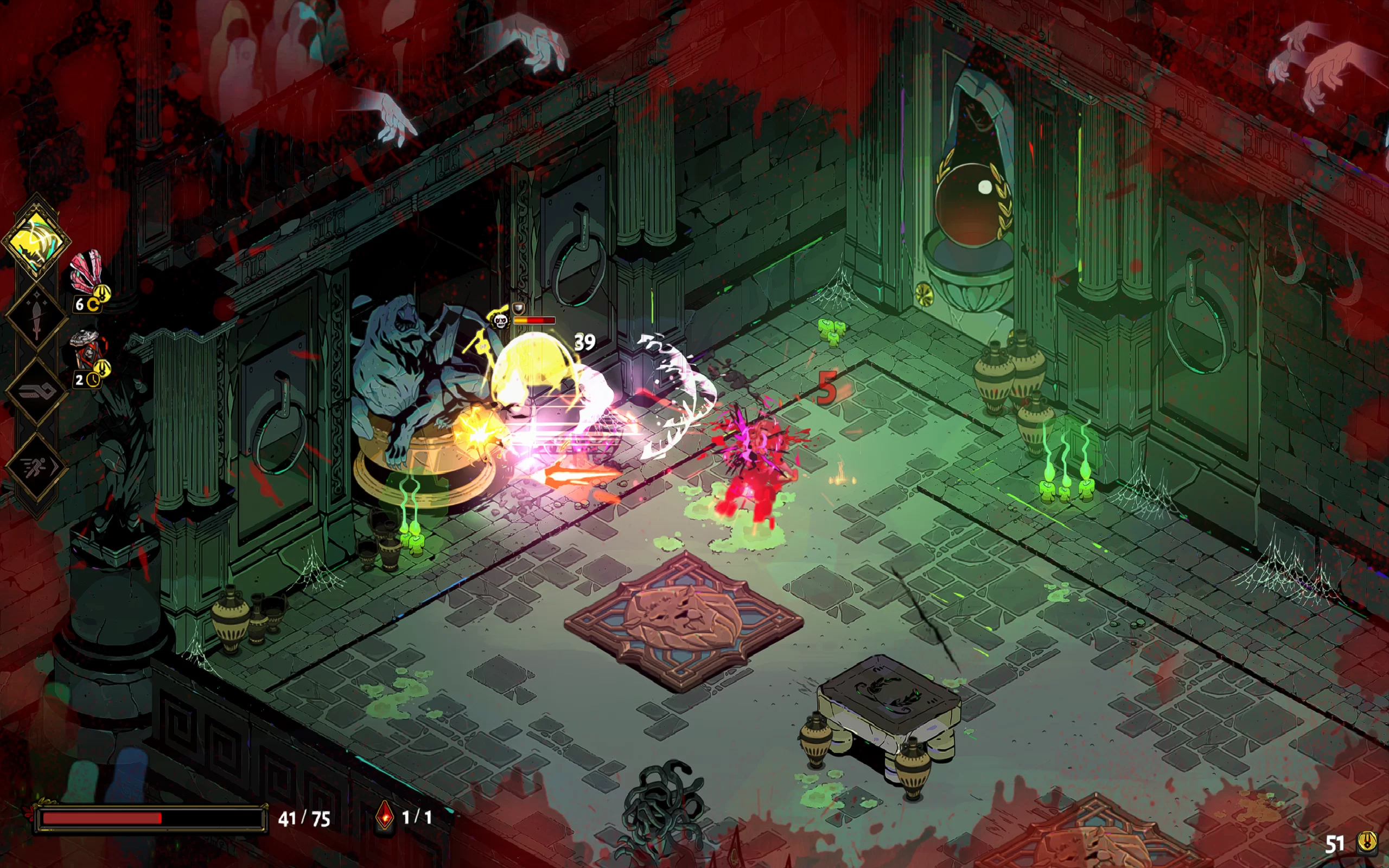 Игровой процесс основан на серии побегов из подземного мира, каждый из которых предлагает новые комбинации врагов, арен и бонусов. Боевая система требует быстрых реакций, грамотного выбора оружия и использования умений, дарованных богами Олимпа. Смерть героя не означает конец игры: после поражения Загрей возвращается во дворец Аида, где можно улучшать навыки и открывать новые возможности для следующих попыток.