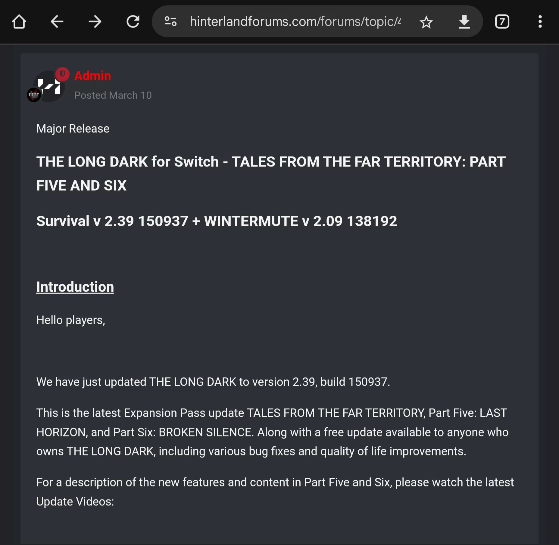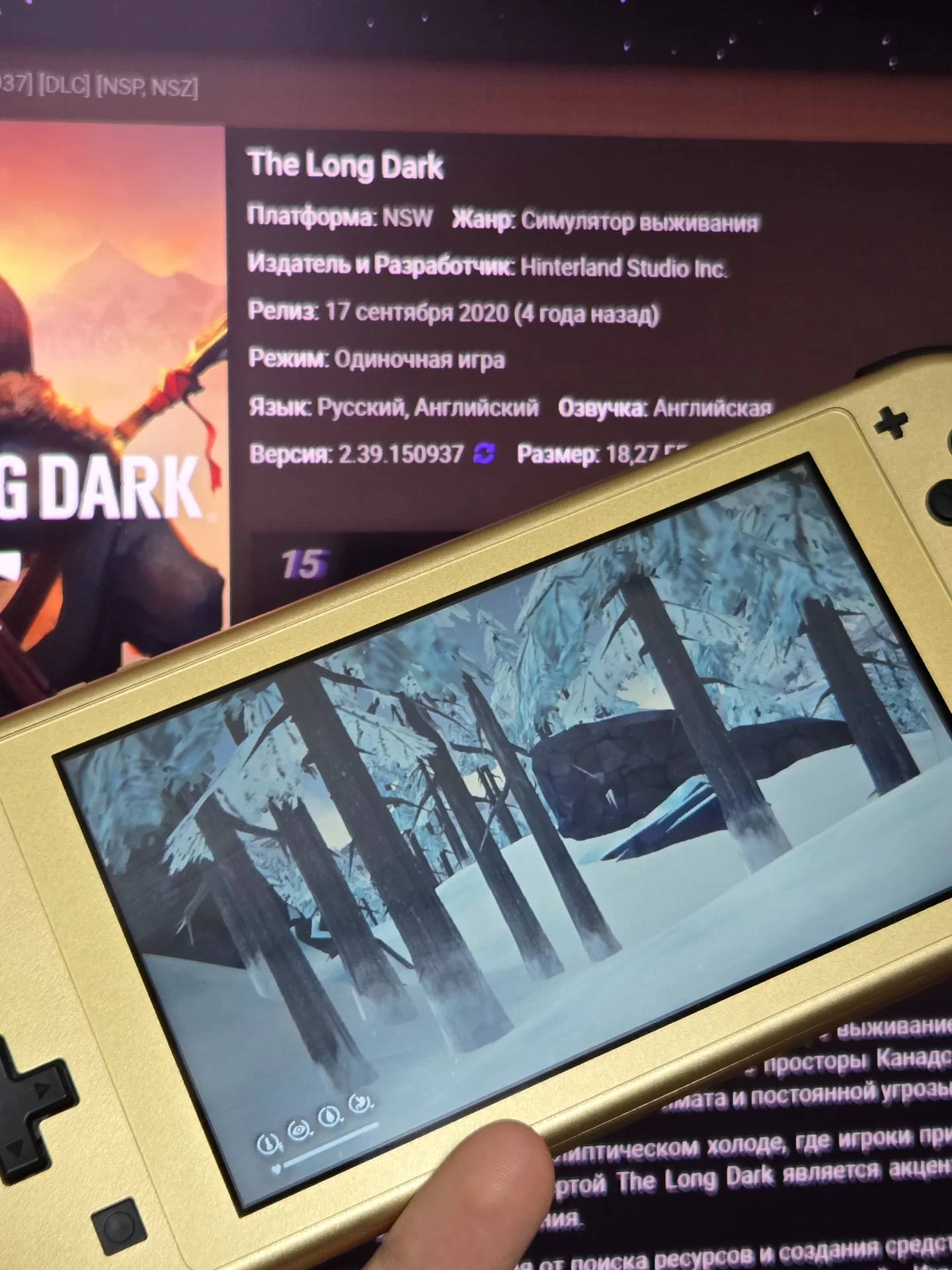 The Long Dark (с англ. «Долгая тьма») для Nintendo Switch — увлекательная игра в жанре выживание, разработанная студией Hinterland Studio Inc. Игра переносит игроков в холодные и безжалостные просторы Канадских лесов после глобальной катастрофы, где им предстоит выживать в условиях сурового климата и постоянной угрозы дикой природы.